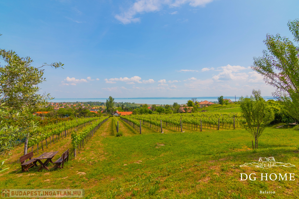 Eladó Csopakon egy 2018-ban épült, 165 m²-es, elegáns újszerű családi ház, páratlan balatoni panorámával, amely minden évszakban lenyűgöző látványt nyújt. Az ingatlan egy 3096 m²-es telken helyezkedik el, melyet gondosan művelt, minősített olaszrizling szőlő ölel körül.