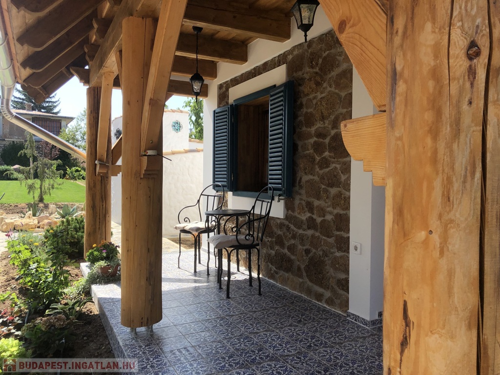 A ház központi tere a napfényben úszó fa körterasz, melyhez kényelmes nappali és egy fürdőszoba kapcsolódik. A konyhában a tömörfa konyhabútor AEG gépekkel és kézzel készített kerámia burkolatokkal egészül ki, ami valódi mestermunka.