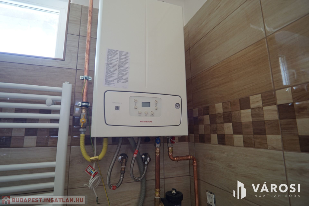 A ház melegét egyedi kombi, kondenzációs gáz cirkó kazán biztosítja, padlófűtés és radiátorok segítségével. A nyári napok lehűtésében klíma segédkezik. (hűtő-fűtő)