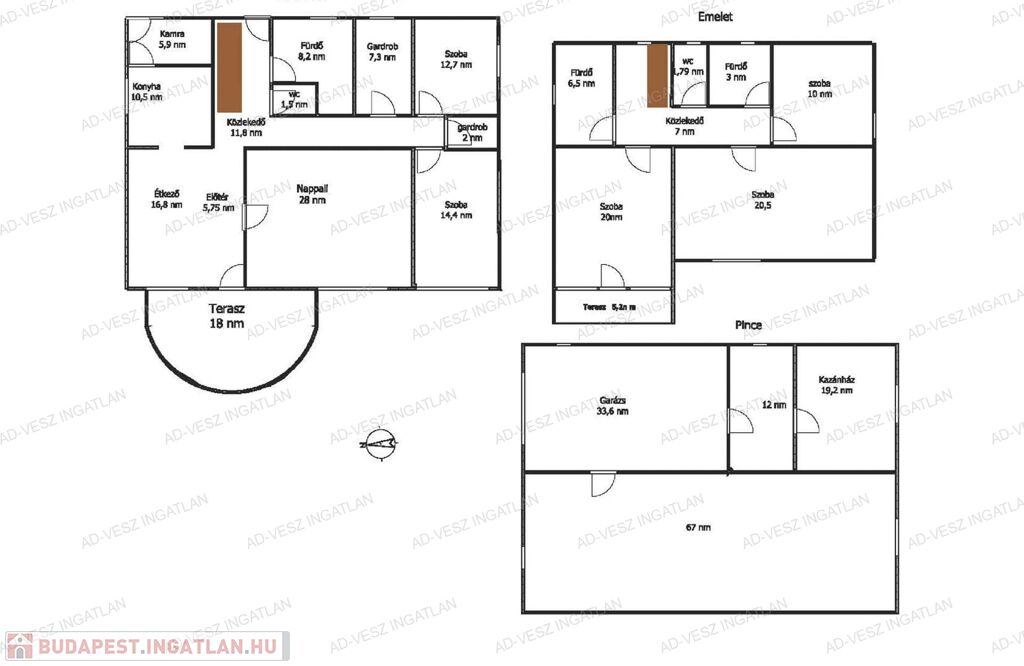 Pince 132m2, földszint 126m2, tetőtér 69m2, garázs 36m2.