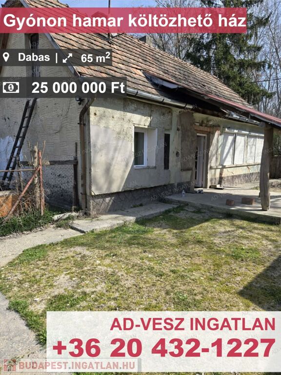 Eladó Dabas-Gyón csendes, családi házas övezetében egy felújítandó ingatlan, mely ideális lehetőséget kínál saját ízlés szerint történő átalakításra. Az ingatlan alapterülete 65m2, míg a telek mérete 1311m2, így bőséges teret biztosít a kertészkedéshez, vagy akár bővítési lehetőségekhez is.