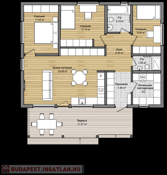 A ház belső elosztása: 3 hálószoba, amerikai konyhás nappali, 2 fürdőszoba, tároló + 21 cm terasz.
