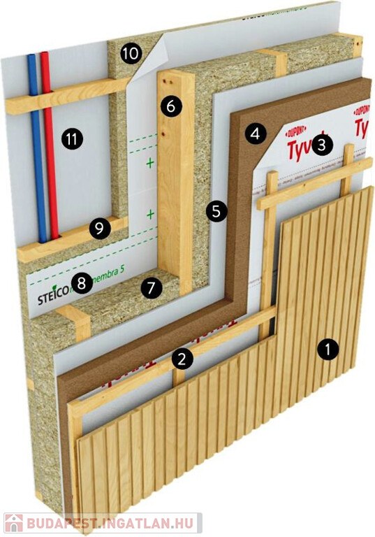 Passzív ház az, amelynek fűtési igénye egytizede a normál lakóházaknak. Kiváló hőszigetelés: A+++, ami azt jelenti, hogy az alapban 30 cm vastag XPS 300 az aljzatbeton alatt, a 20 cm vázszerkezetben kívül és belül is 2X5 cm táblás bazaltgyapot szigetelés, illetve minimum 5 cm kiszellőztetett légrés a főfalakban és a tetőszerkezeben is.