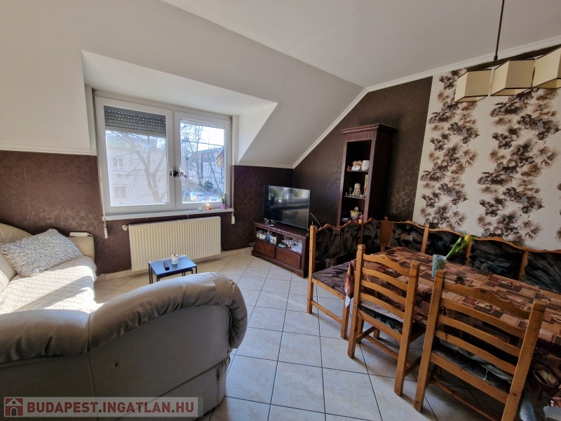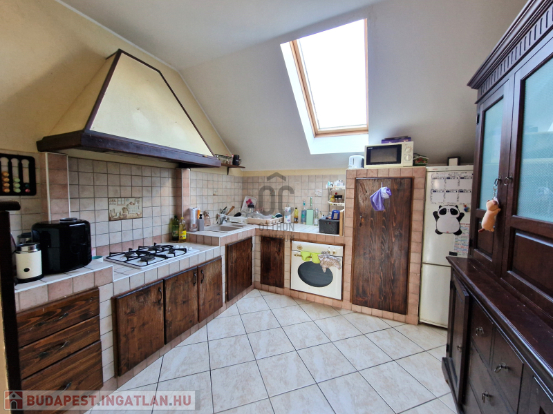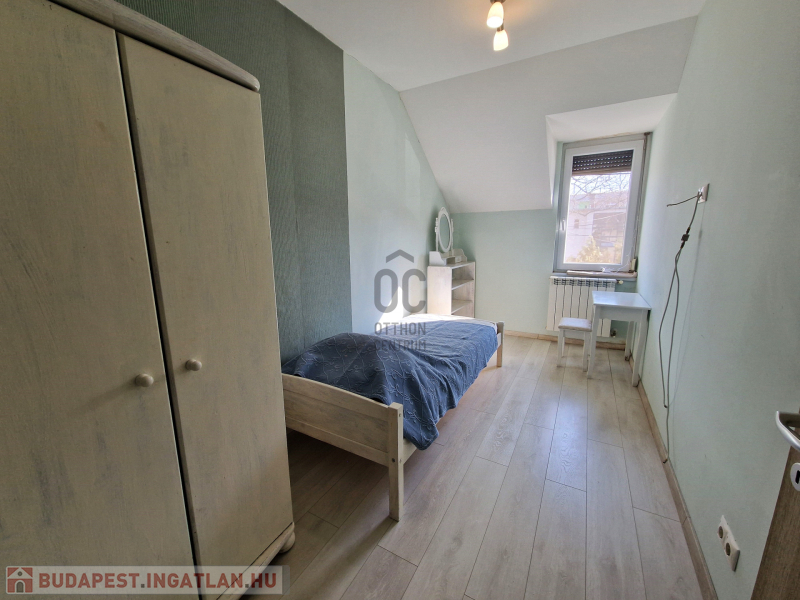 Emelet helyiségei: Nappali, konyha, étkező, 3 hálószoba, fürdő szoba-wc-vel egy helyiségben, 5 nm-es loggia. Fiatalos, modernizált belső terek.