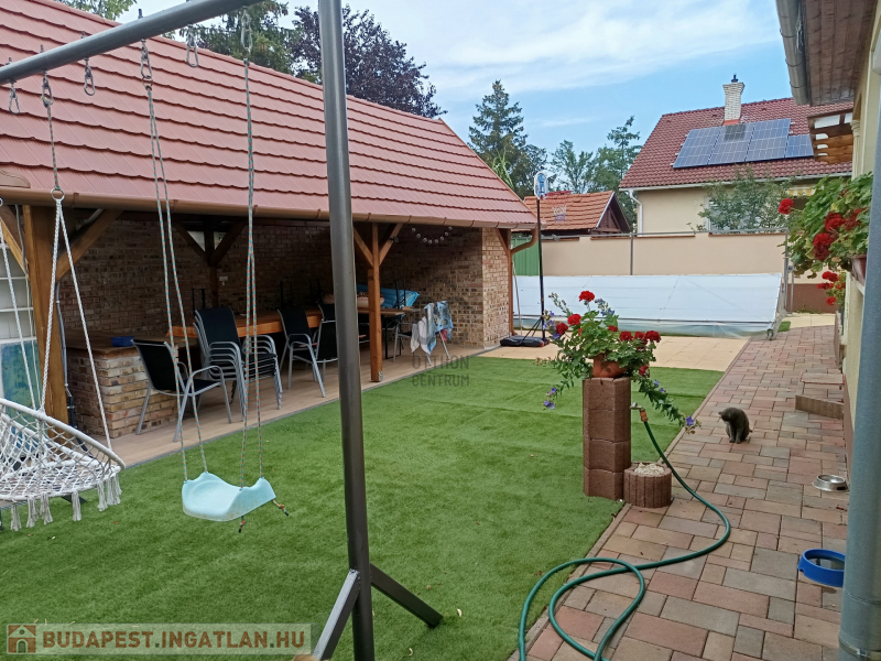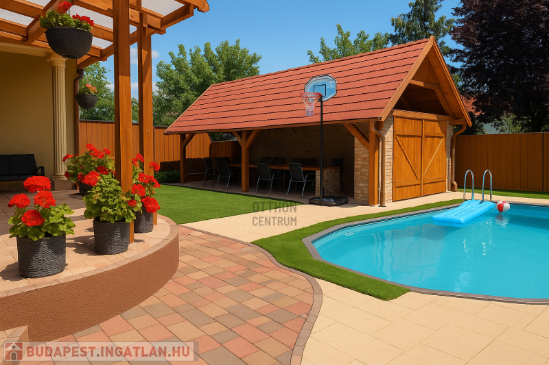 A 550 m²-es, gondosan parkosított telek igazi ékszerdoboz: a fedett teraszok, a beépített filagória, a bográcsozó és a kerti zuhanyzó tökéletes helyszínt kínálnak a családi és baráti összejövetelekhez, a saját gépészettel szerelt, fedhető 3x7 méteres medence pedig a nyári kikapcsolódás elengedhetetlen része. Az udvar műfűvel és térkővel borított, beépített tárolókkal praktikus megoldásokat nyújt, az automata öntözőrendszer pedig a virágok, évelő növények, vetemény és a termő barackfák gondozását könnyíti meg.