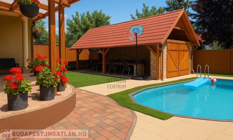 A 550 m²-es, gondosan parkosított telek igazi ékszerdoboz: a fedett teraszok, a beépített filagória, a bográcsozó és a kerti zuhanyzó tökéletes helyszínt kínálnak a családi és baráti összejövetelekhez, a saját gépészettel szerelt, fedhető 3x7 méteres medence pedig a nyári kikapcsolódás elengedhetetlen része. Az udvar műfűvel és térkővel borított, beépített tárolókkal praktikus megoldásokat nyújt, az automata öntözőrendszer pedig a virágok, évelő növények, vetemény és a termő barackfák gondozását könnyíti meg.