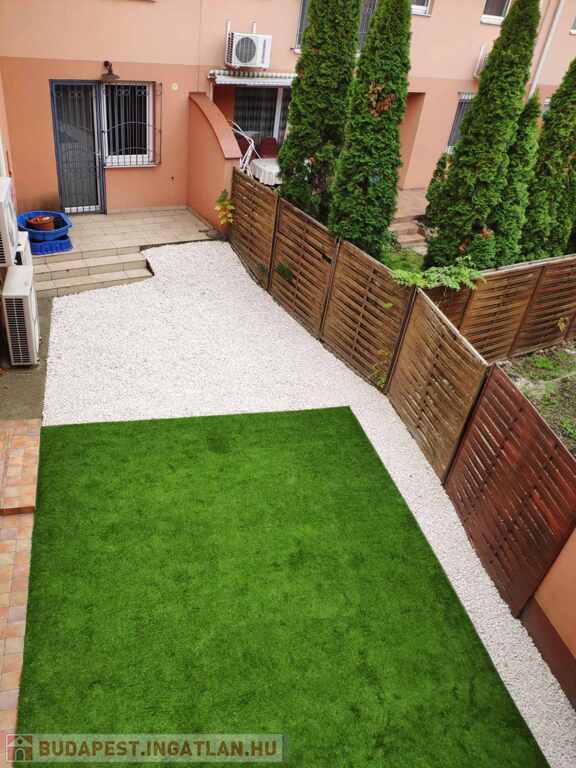 A házhoz előkert és hátsó kert is tartozik, melyek kifejezetten alacsony fenntartási igényűek.