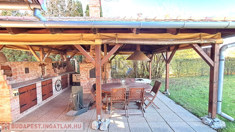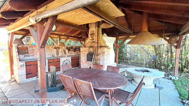 --a kertben van egy fa szerkezetű filagória, búboskemencével, bográcsozóval, kinti konyhával és étkezőhellyel