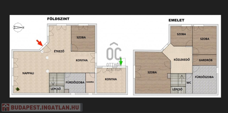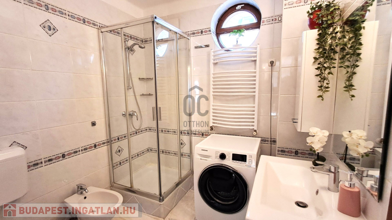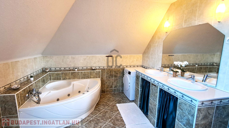 --a földszinten zuhanykabinos, az emeleten hidromasszázs sarokkádas fürdőszoba dupla mosdókagylóval