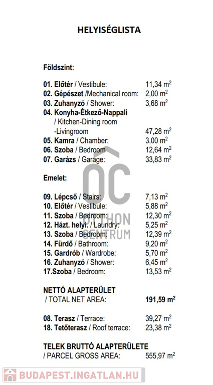 Az ingatlan alapterülete 191 nm, míg a telek mérete 555 nm.