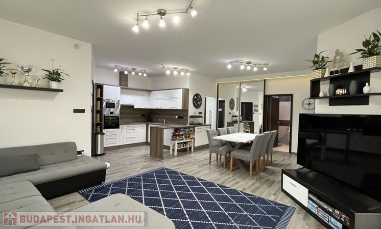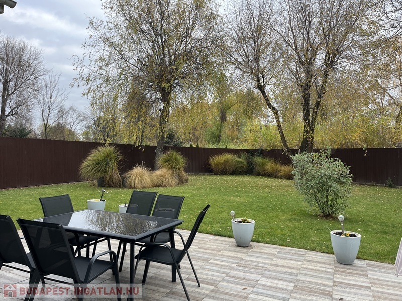 Eladó egy 141/120 m2-es, barátságos, tágas, világos 2+2 szobás sorház, hatalmas amerikai konyhás nappalival, 2 fürdõszobával, 2 WC-vel, nagy pihenõkerttel.