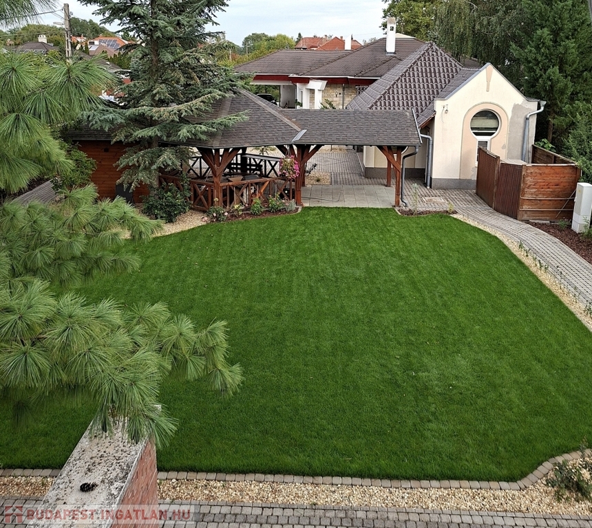 Az udvar öntözőrendszerrel felszerelt, így a sok örökzöld, virág, fű minimális karbantartást igényel. 10-15 növényeket, fákat megvilágító kerti lámpák az esti kerti sétákhoz. Sziklakert és vízköpő egyik és másik végén az udvarnak, hogy garantált legyen a kerti öröm. A kinti grillezőn, sütni kedvelőknek fedett főző rész füstkivezető üsttel. A dupla garázsban (50nm) wc, praktikus monolit födém jó belmagasság padlástér plusz tárolási lehetőség.