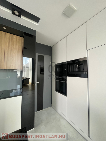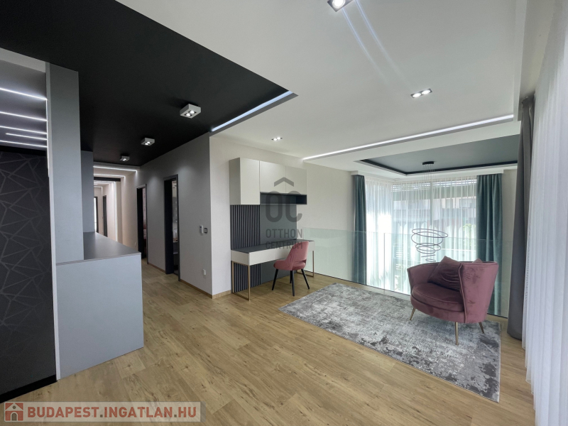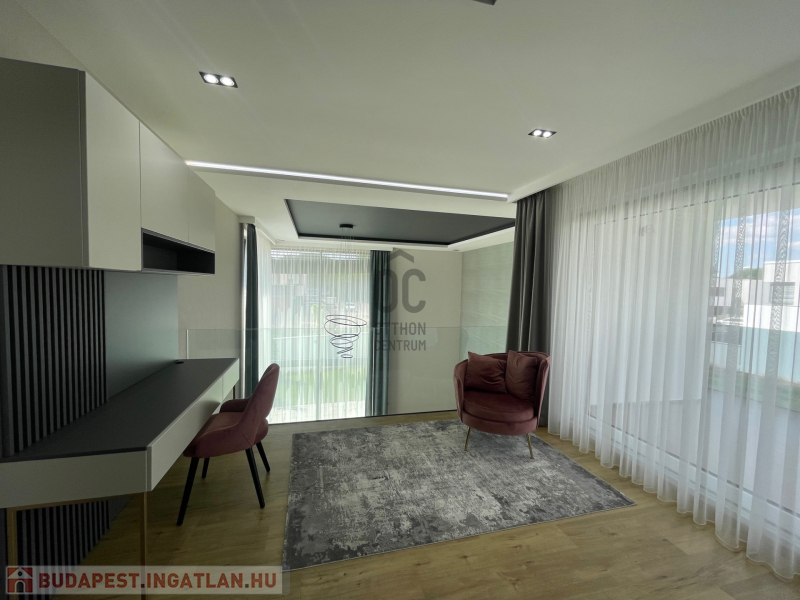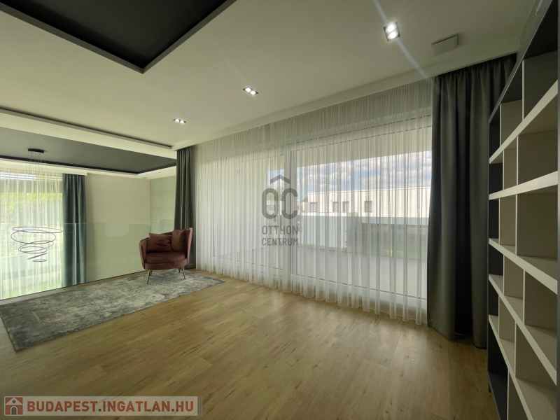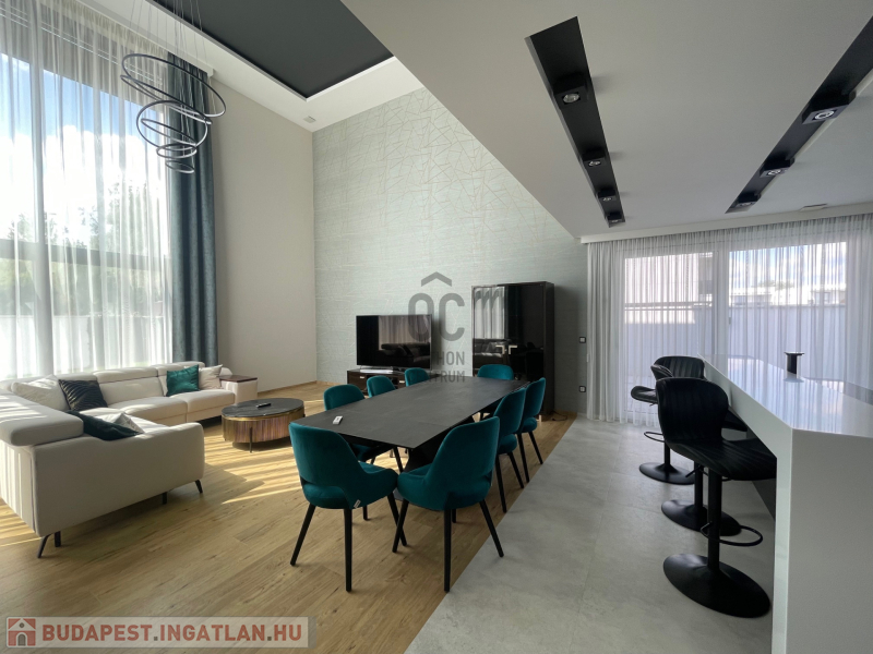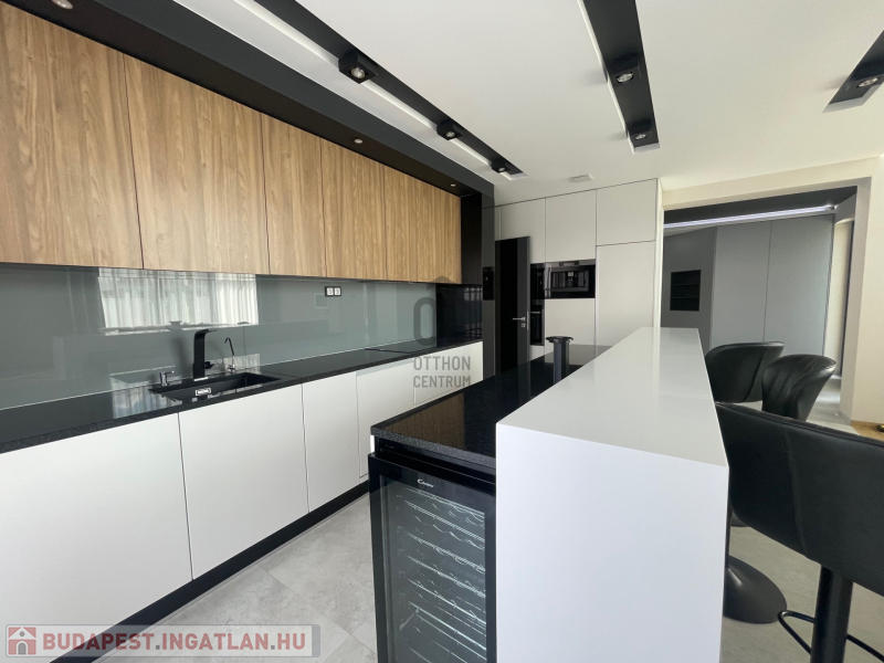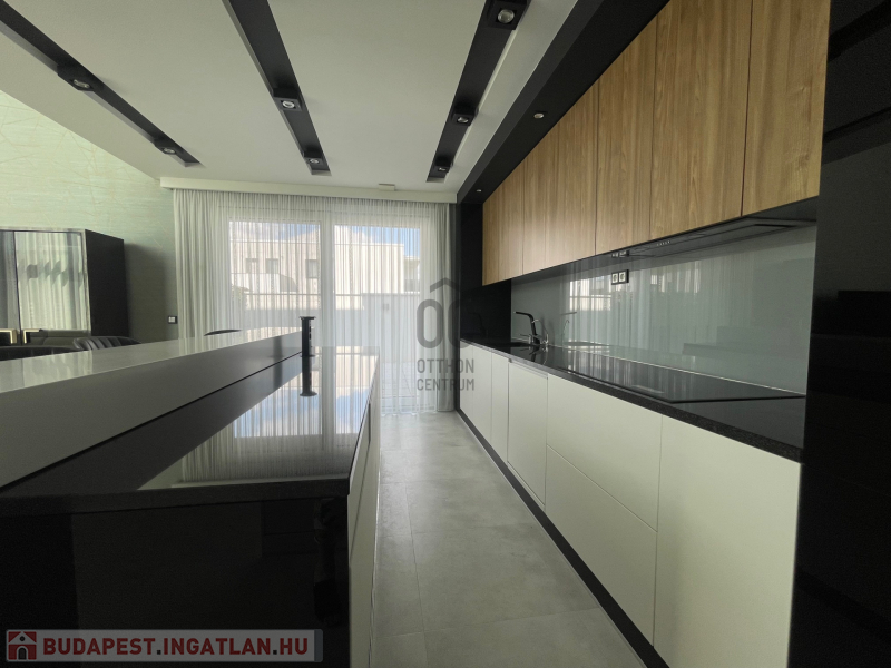 - Lélegzetelállítóan tágas, nagy belmagasságú, amerikai konyhás nappali padlótól plafonig érő üvegfelületekkel és közvetlen teraszkapcsolattal