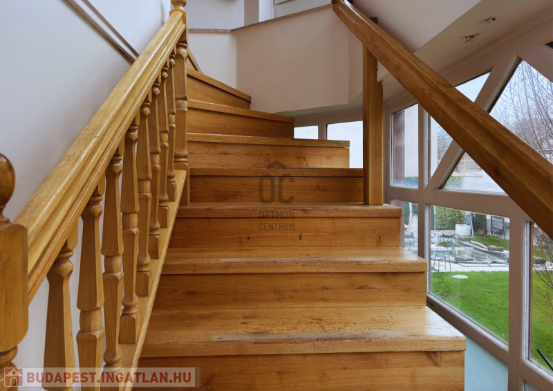 Egy elegáns fa lépcső vezet fel a felső nappaliba.