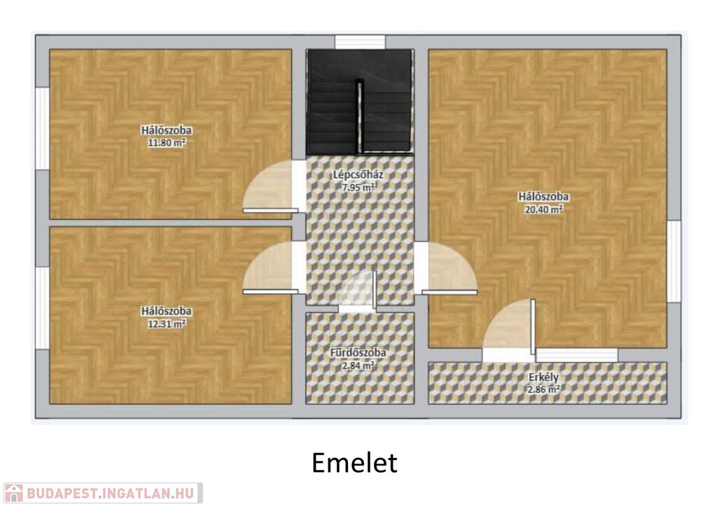3 jó méretű hálószobája + fürdőszoba az emeleten kapott helyett. Szobáiban kifogástalan állapotú eredeti fa parketta található.