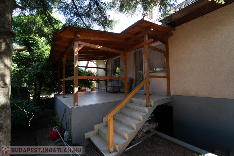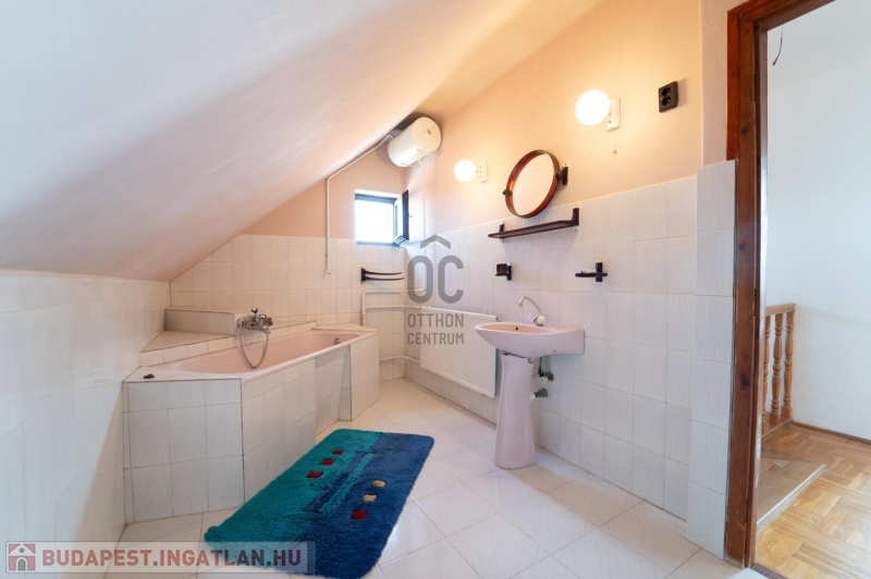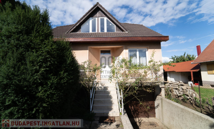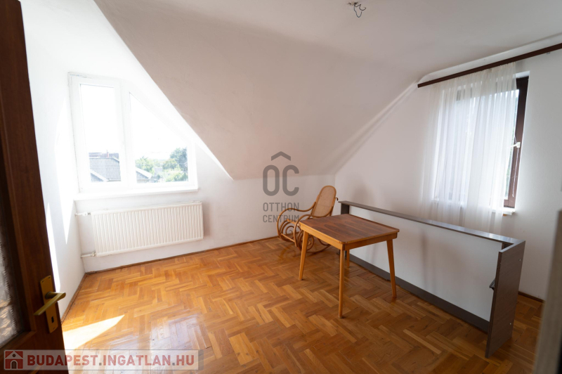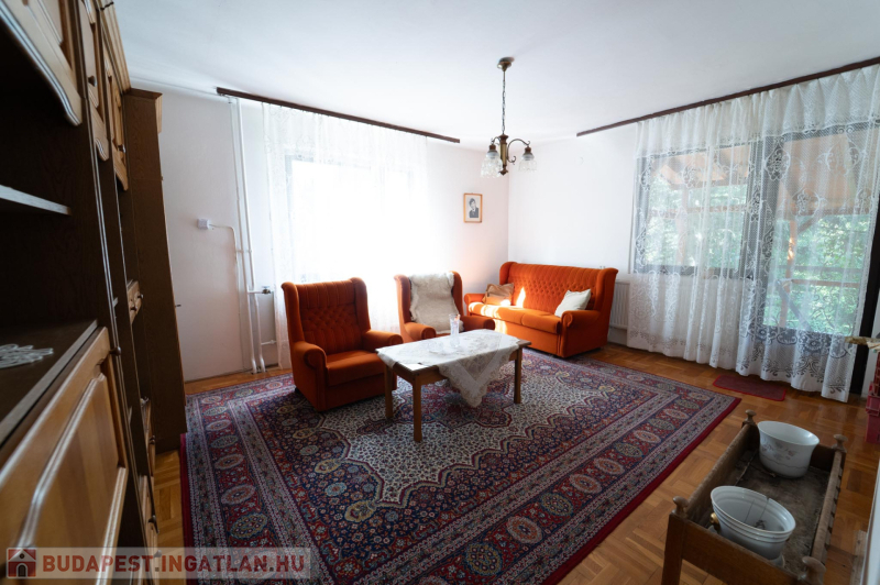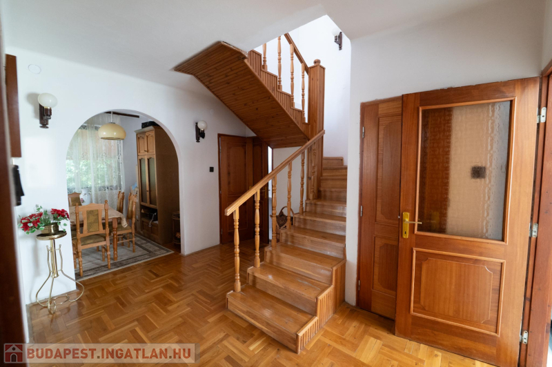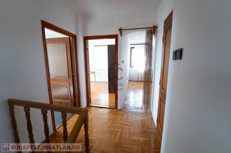 A 90-es évek elején épült, masszív szerkezetű családi ház két lakószinttel és teljesen alápincézett kialakítással rendelkezik. A pince szinten négy helyiség kapott helyet, köztük a garázs és a kazánház, ahol gáz- és vegyes tüzelésű kazán is biztosítja a fűtési lehetőségeket. Az alsó szinten a tágas előszoba után egy impozáns hall fogad, innen nyílik a 30 négyzetméteres nappali, az étkező és a konyha kamrával. Ugyanitt található egy hálószoba, egy fürdőszoba és egy külön wc is. A nappaliból egy 17 négyzetméteres fedett teraszra léphetsz ki, ahonnan a kert nyújt pihentető kilátást. Az emeletre széles falépcső vezet, ahol két nagyobb szoba került kialakításra, valamint egy kényelmes, világos fürdőszoba is szolgálja a család mindennapjait.