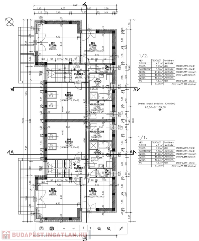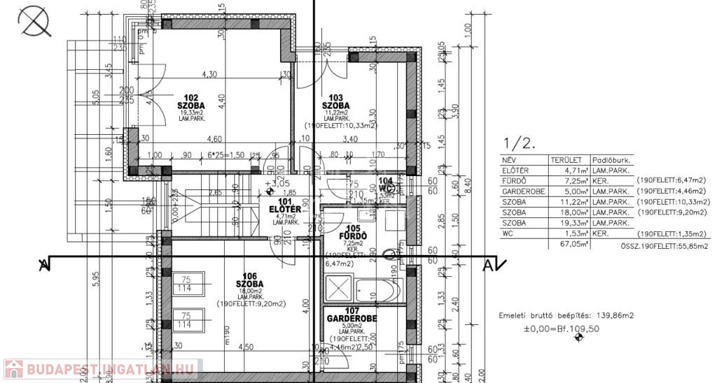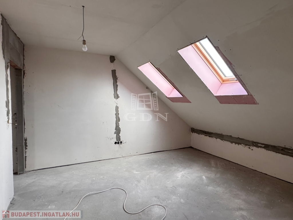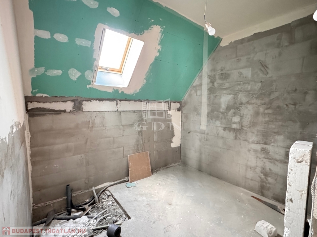közlekedő-lépcsőtér 9,4 m2, 3 szoba (19,33 m2, 11,22 m2, 9,20 m2), fürdőszoba (7,25 m2), WC (1,53 m2), gardrób (5 m2).