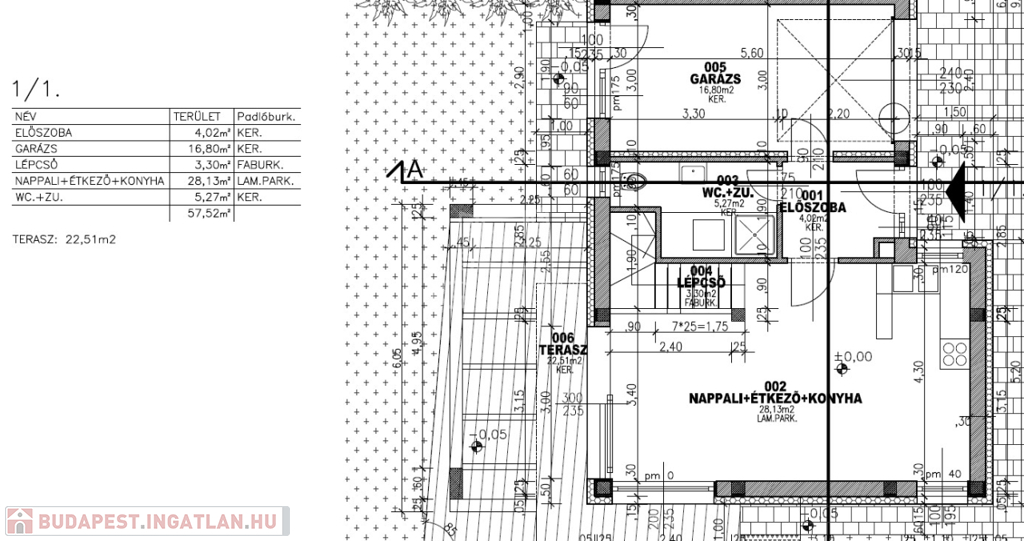előszoba 4 m2, nappali-étkező+ konyha 28 m2, zuhanyozó +WC (5,27 m2), emeletre vezető lépcsőtér 3,3 m2, garázs 17,4 m2, plusz egy 22,5 m2-es terasz került kialakításra.