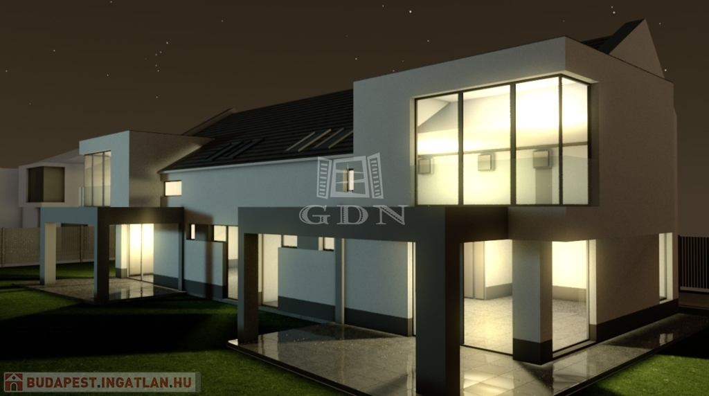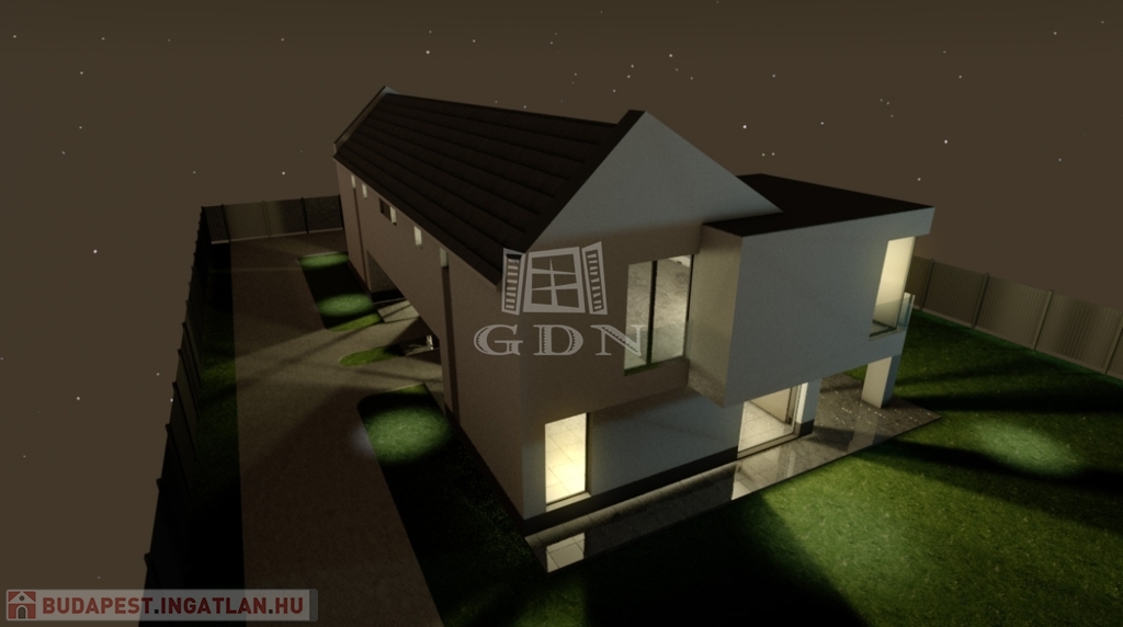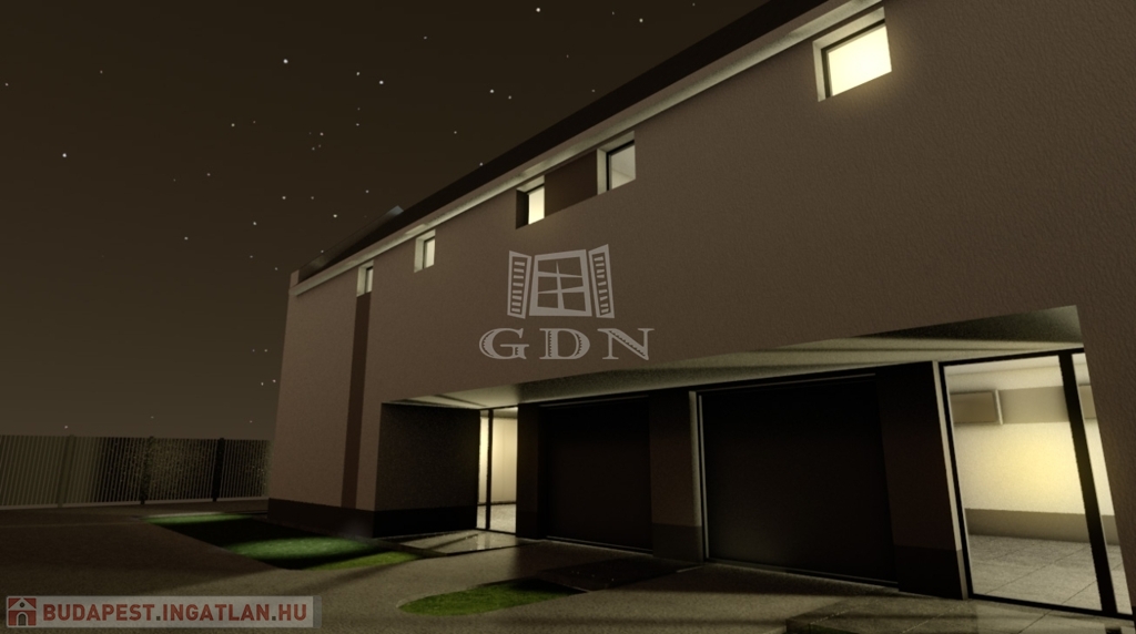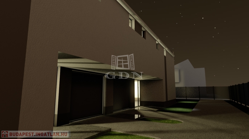 Az utcafronti, előkertes ikerházfél (1. számú lakóház) 372 m2-es telekrészen épült, elkerítve a hátsó féltől, garázzsal.