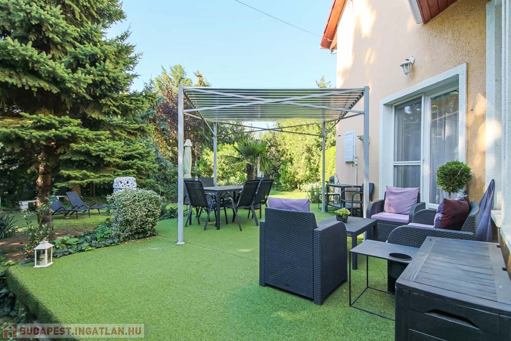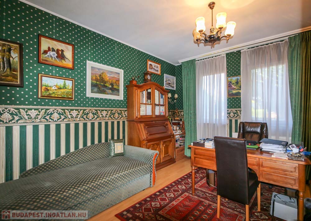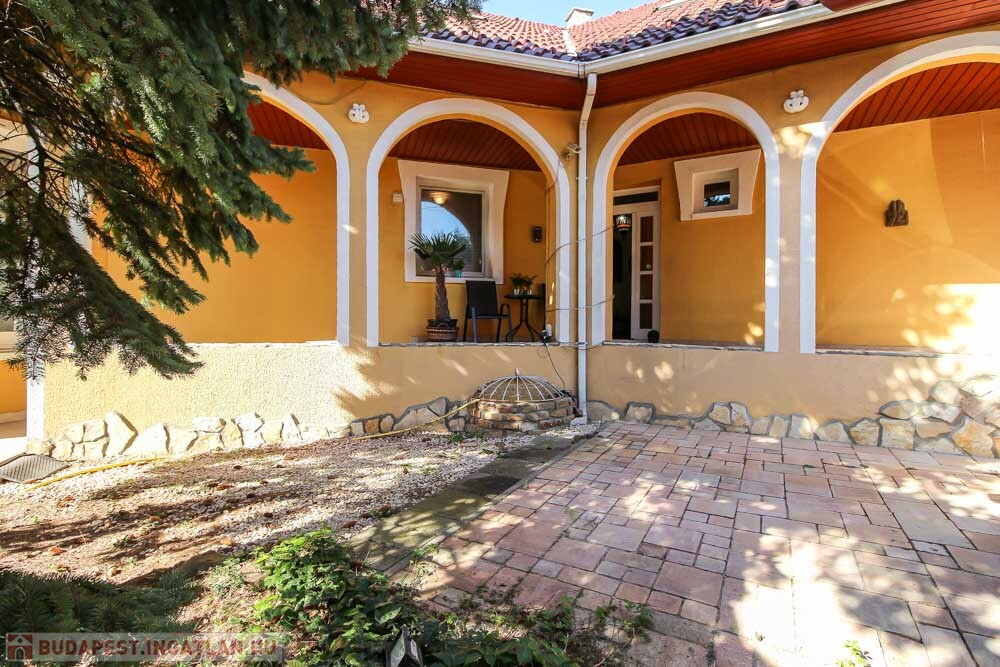 A szóba forgó klasszikus stílusban épült tornácos családi ház , a kíváncsi szemek elől elzárt ősfás park része, melyben az örökzöldeken kívül helyett kapott egy grillterasz, egy kerti tó és a garázson kívül udvari autóbeállók is. Az eladó ingatlan lakóterülete két szinten összesen 280 nm, mely jelenlegi elosztása szerint a hall-t, 2 fürdőszobát egyet szaunával, + 1 illemhelyet, 6 szobát egy nyitott nappalit takar. Utóbbihoz inkább a szalon megnevezést tartanám kifejezőnek, mivel e helység és a konyha, étkező együttese összesen 70 négyzetméterével a ház központi eleme, természetesen teraszkapcsolattal. Igazán impozáns a hatalmas ablakaival, boltíves díszítő elemeivel, kandallóval, bársarokkal, e helység belmagassága 3.4 m, ami csak emel a szinten.
