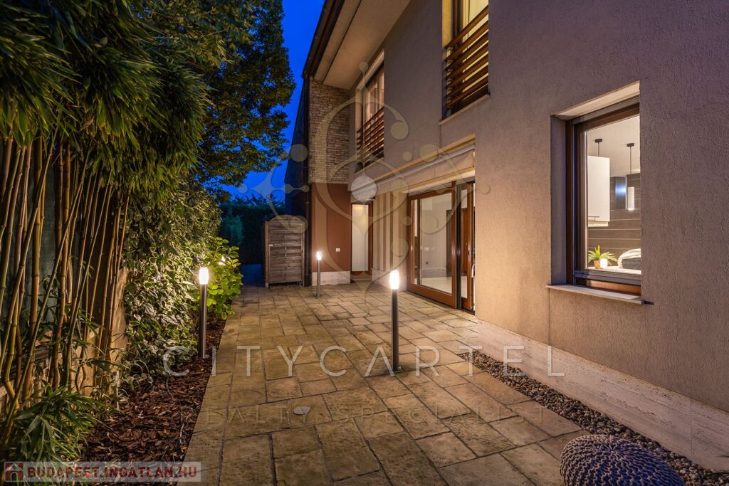E ingatlanhoz 205/350 tulajdoni hányad tartozik. Ezen belül 305 nm privát, parkosított kert áll rendelkezésre, amely közvetlen kapcsolatot biztosít a két hatalmas teraszhoz és a saját wellness-részleghez