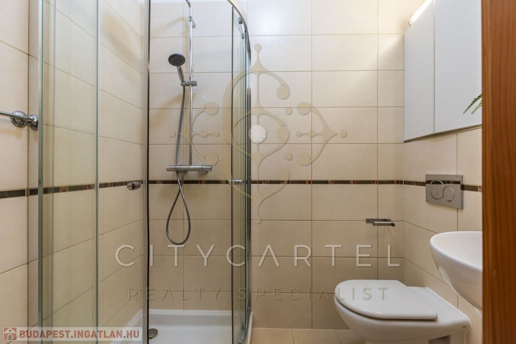 Fürdőszoba: Prémium burkolatokkal, sarokkáddal, zuhanyzóval, WC-vel és bidével felszerelve.