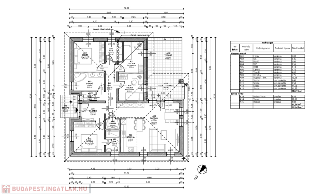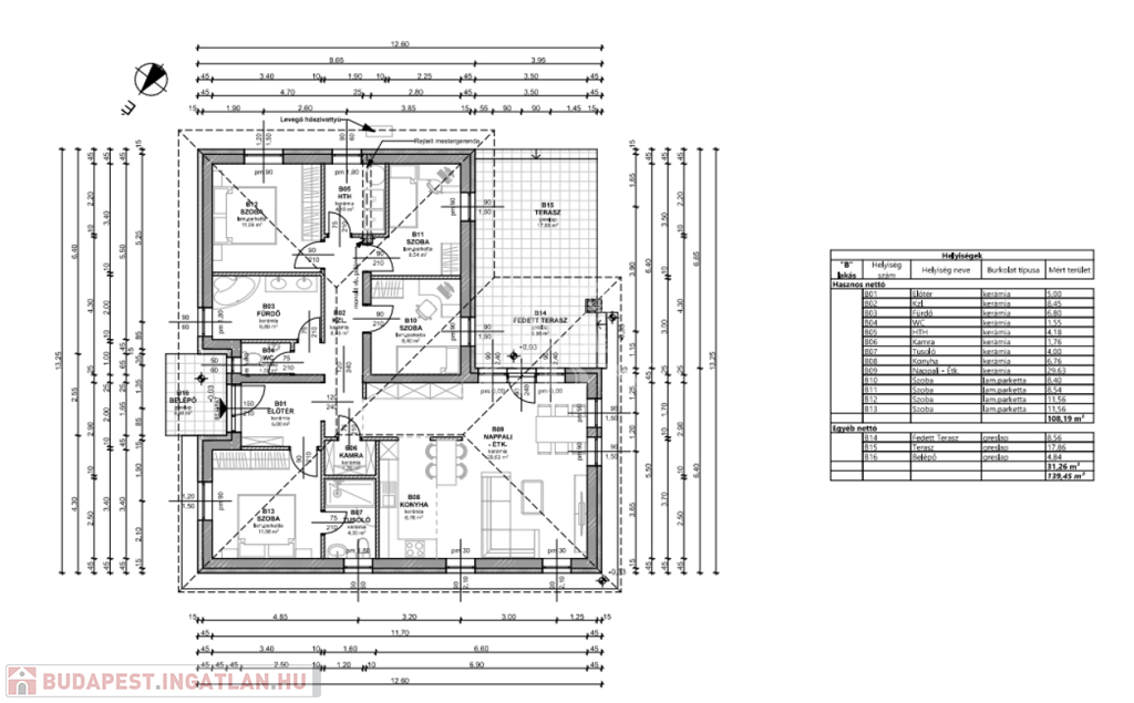 szoba 8,54 m2, szoba 11,56 m2, szoba 11,56 m2, terasz 26,42 m2.