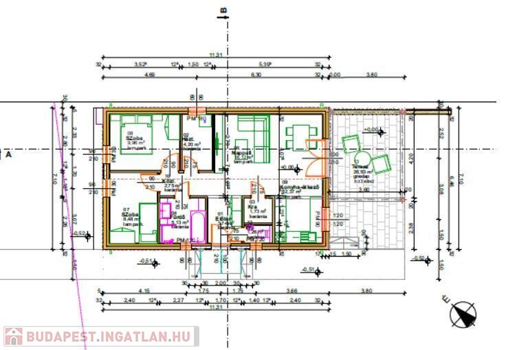 A lakóterület, 67,5m2 plusz 26,5 m2 terasz. (Összesen: 94 m2) Panoráma ajtó nyílik közvetlenül a teraszra az amerikai konyhás nappaliból. Az ingatlanban található még 2 hálószoba, fürdő, külön WC, háztartási helység, a bejáratnál szélfogó.