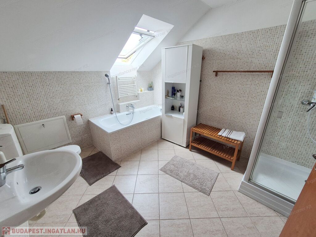 FELSŐ SZINT: Kényelmesen lépcsőfokokon keresztül jutunk az emeletre, ahol egy (4,49m2-es) közlekedőből nyílik: három jó méretű hálószoba (nettó: 12,32m2,12,12m2 és egy 10,06m2) majd egy ablakos káddal és zuhanyzóval felszerelt tágas (nettó: 6,74m2-es) fürdőszoba érhető el.