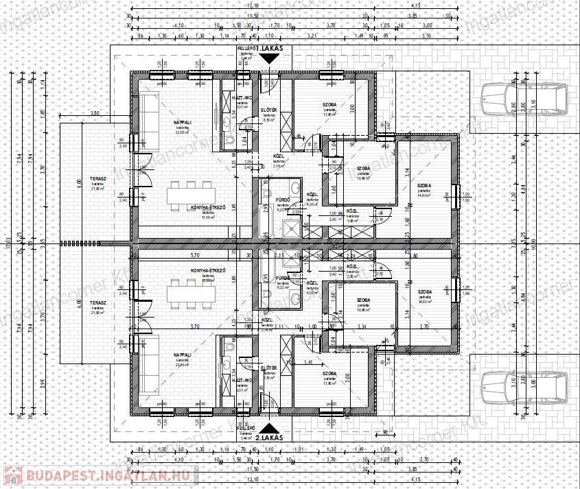 A terveken ház előtti gépkocsi beálló és gyalogos járda viacolor burkolattal kerülnek kiépítésre. Az lakások teraszai hideg burkolattal kerülnek kialakításra, egységes színben.