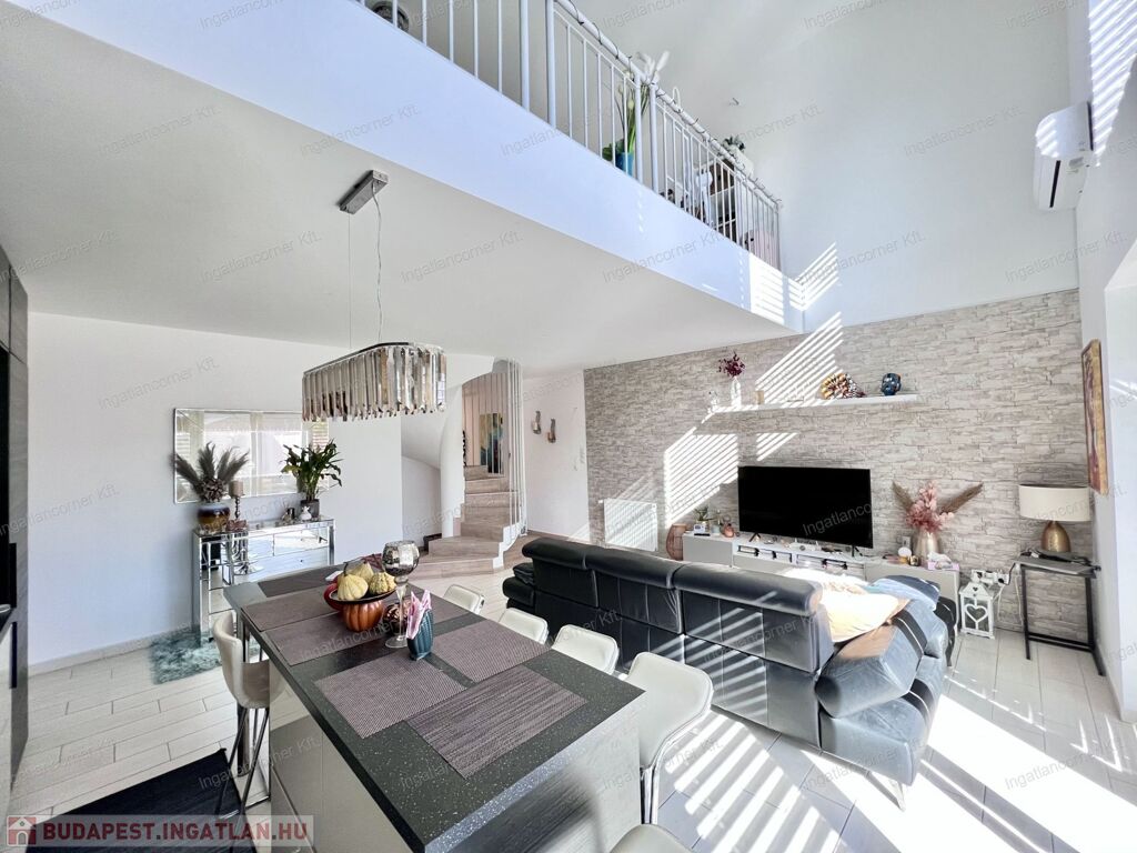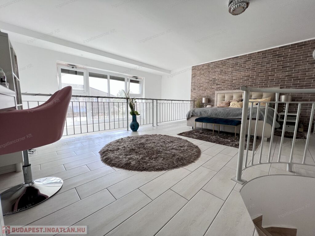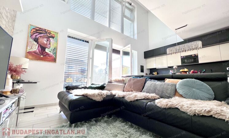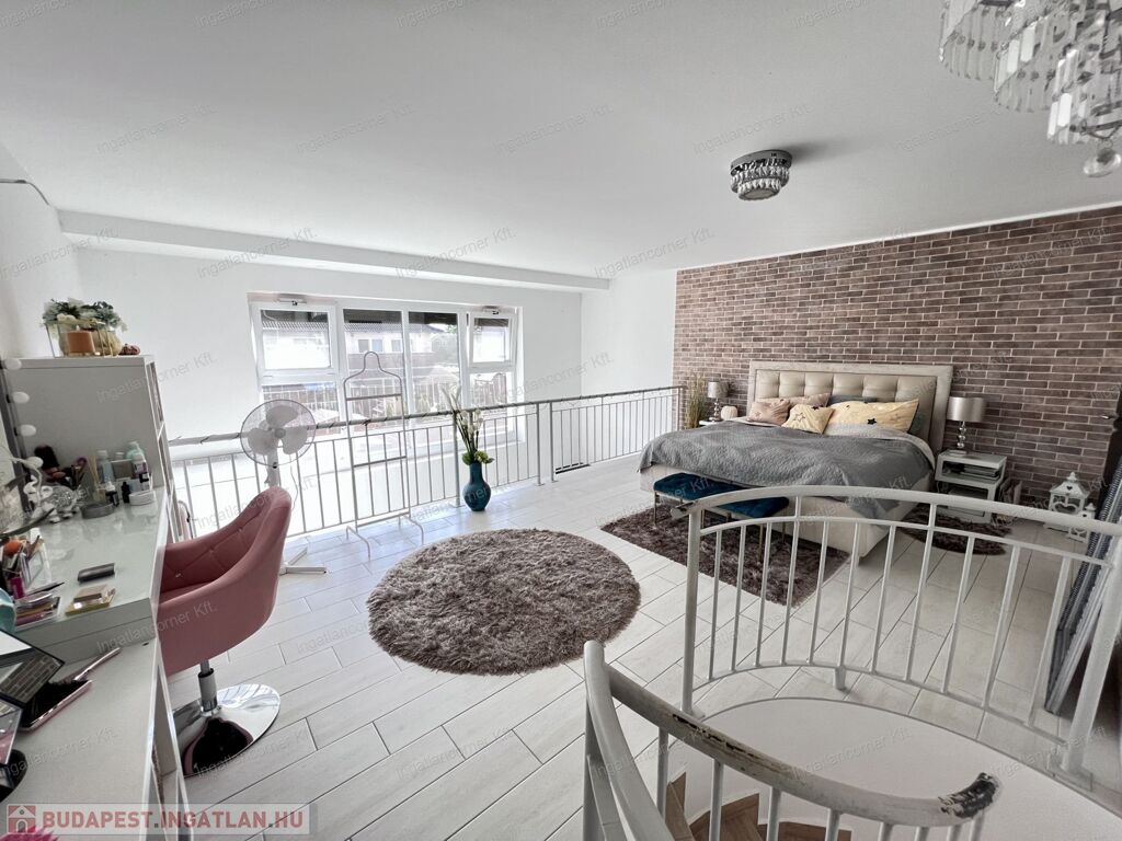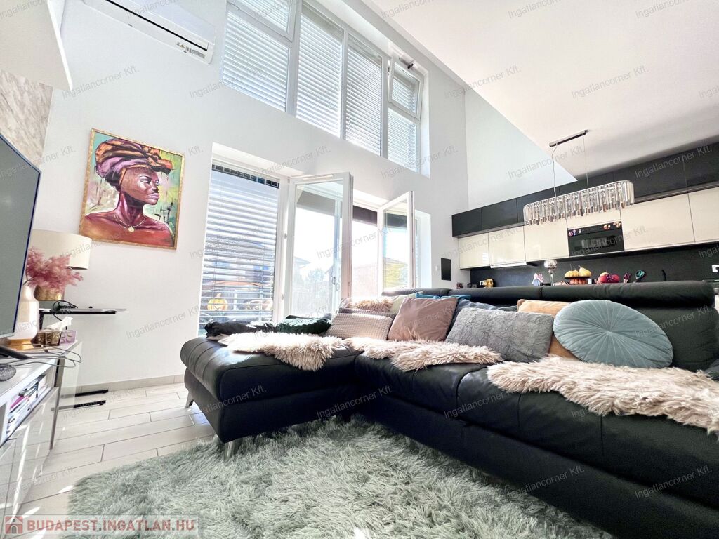 Bezerédi lakóparkban eladó sorházi lakás, dél-keleti homlokzata teljes üveg felület, nappali felett galériás háló!