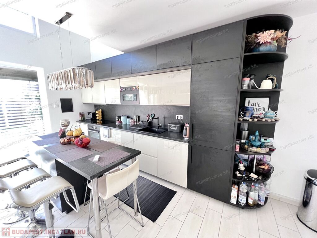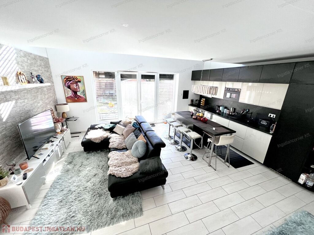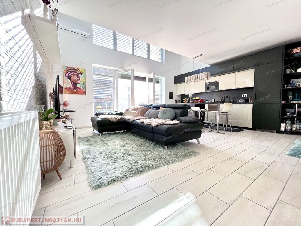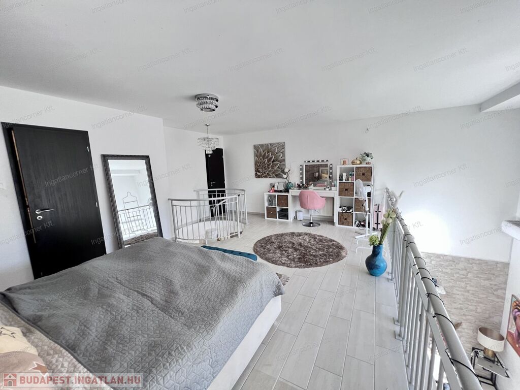 Bezerédi lakóparkban eladó sorházi lakás, dél-keleti homlokzata teljes üveg felület, nappali felett galériás háló!