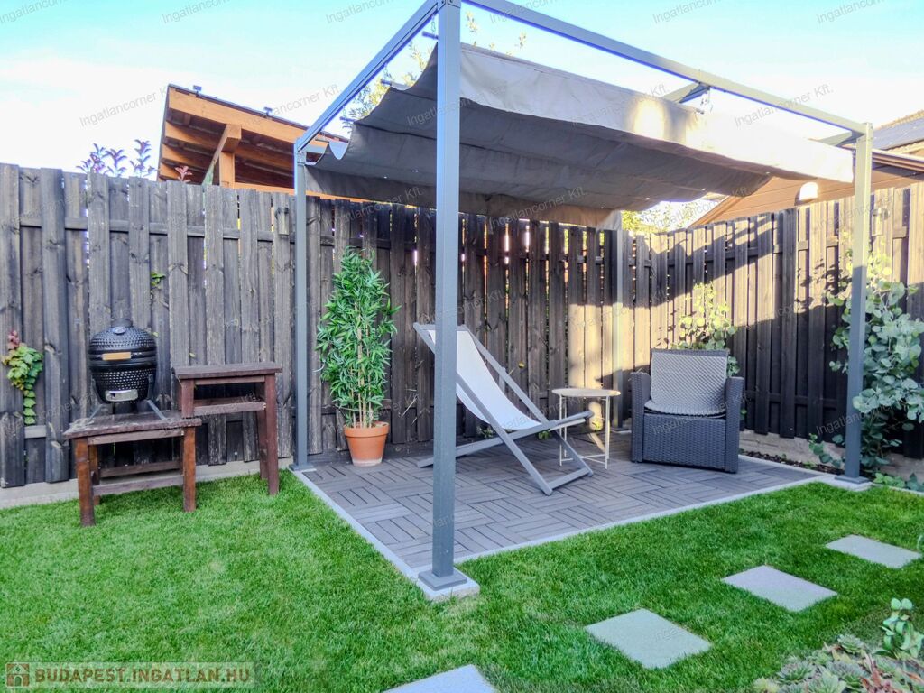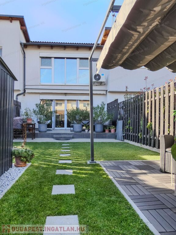 Az exluzív lakáshoz tartozik 195nm saját tulajdonú kert, körbe kerítve. A kert gondozás mentes műfűvel telepített, tárolásra kisház. A nagy méretű teraszon árnyékoló található.