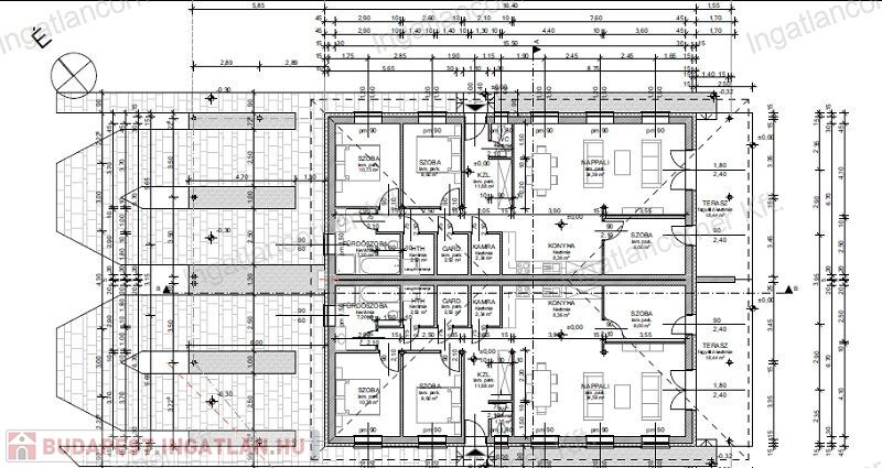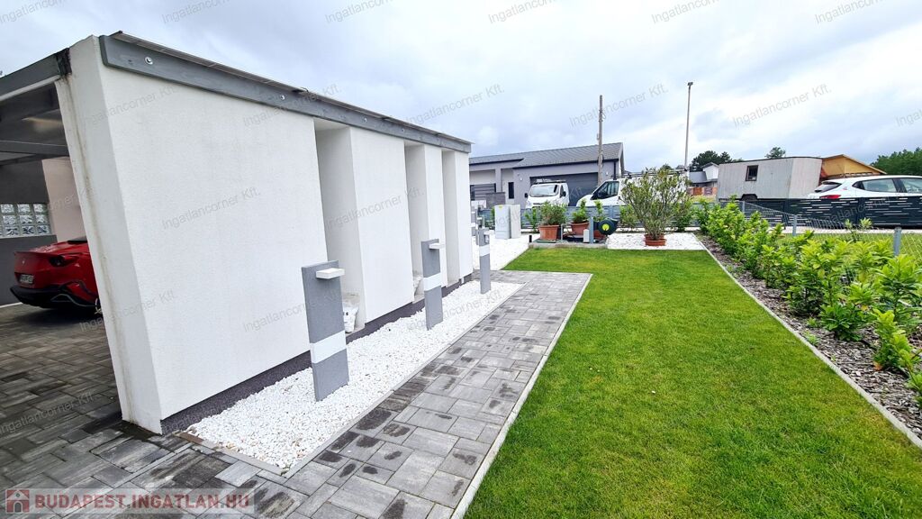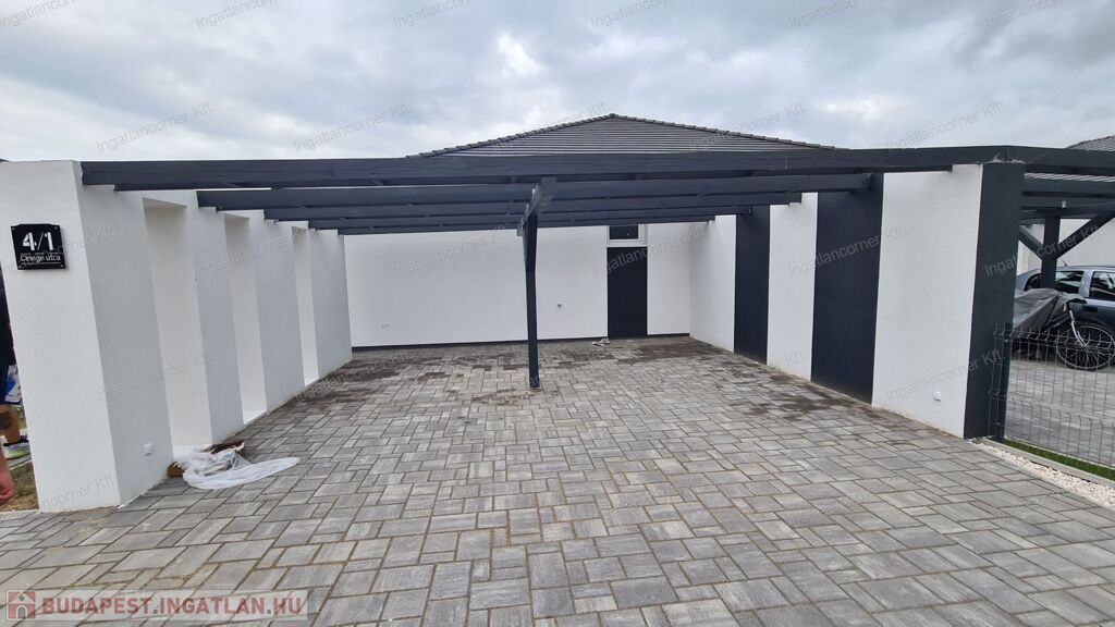 Alapterület 168m2 melyből 105 m2 a hasznos alapterület a terasz 21m2-es amiből 16m2 fedett rész. A kocsibeálló fedett 42m2.