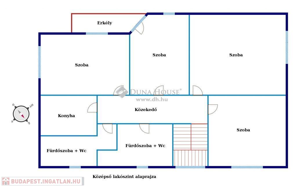 A középső szinten 4 különnyíló hálószoba, két fürdőszoba+wc, és egy konyha találhatóak. Az egyik fürdő és a konyha felújítása megkezdődött, azonban időközben félbe maradt, így e két helyiség befejezésre szorul.