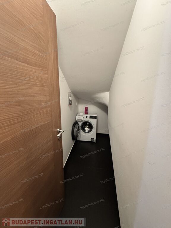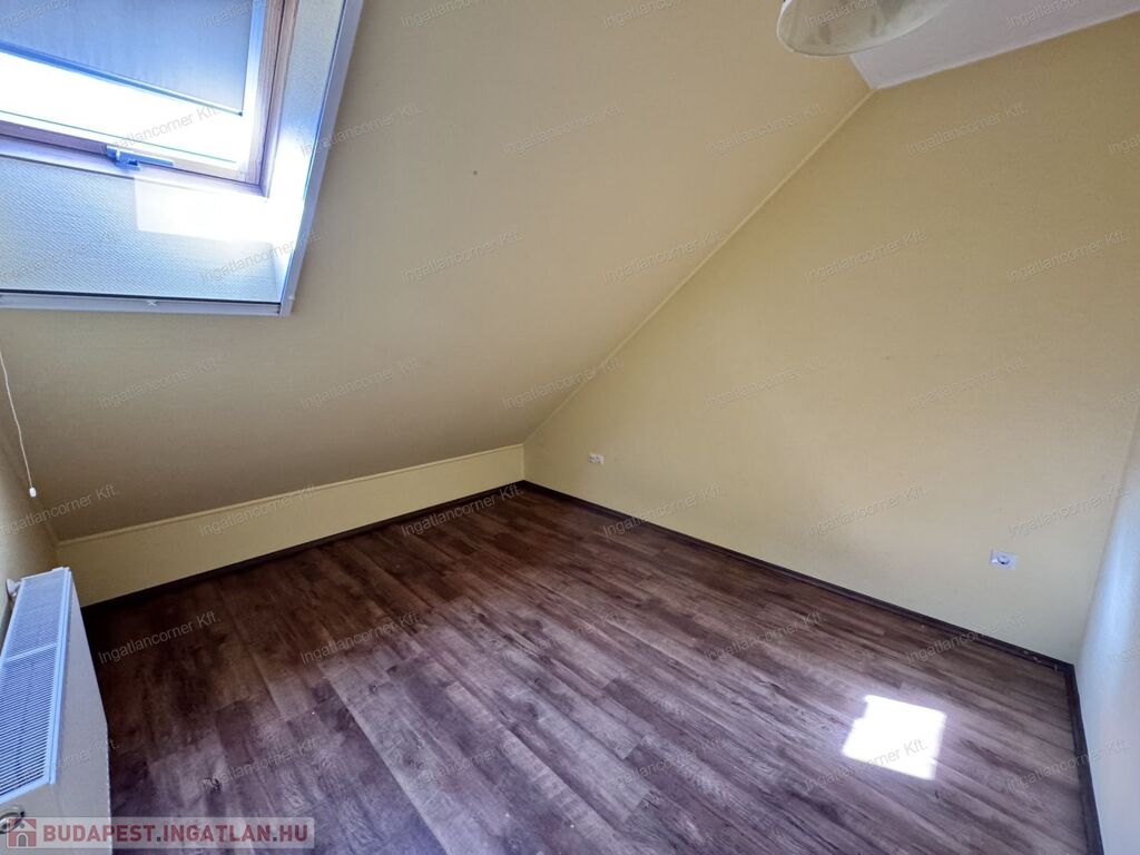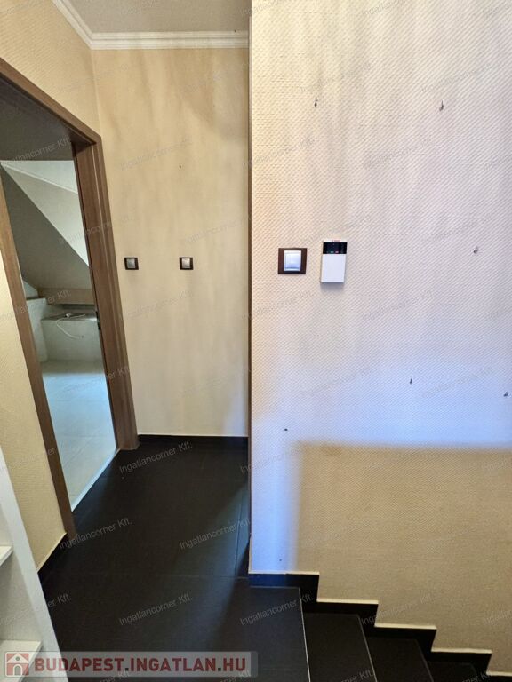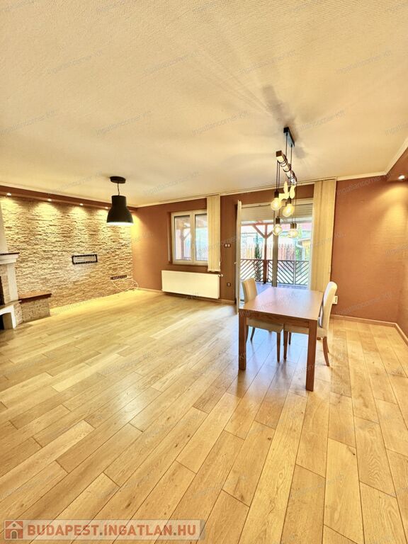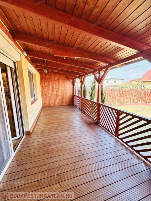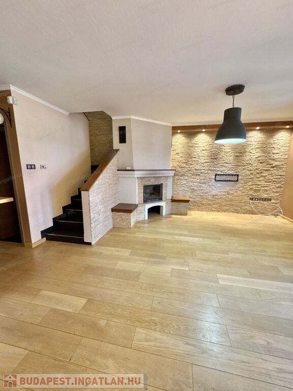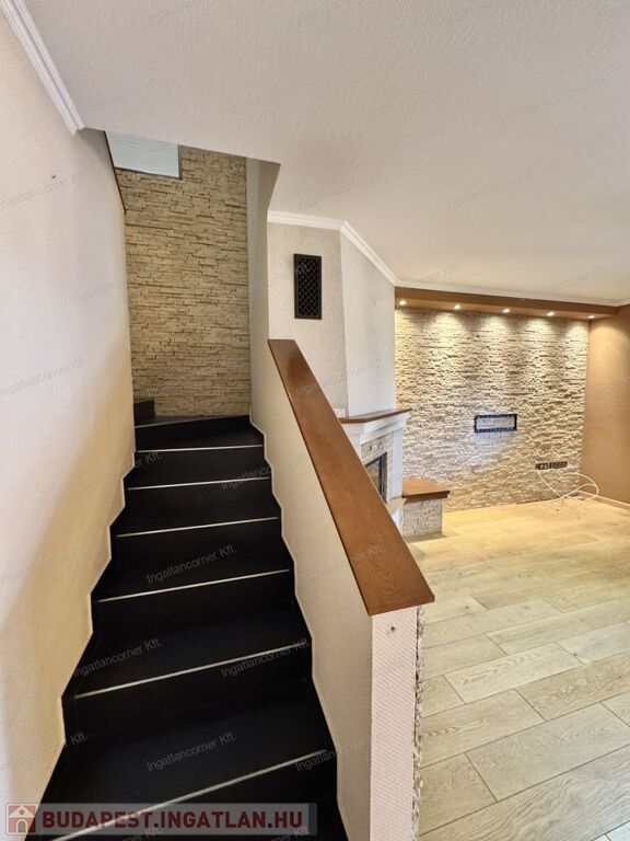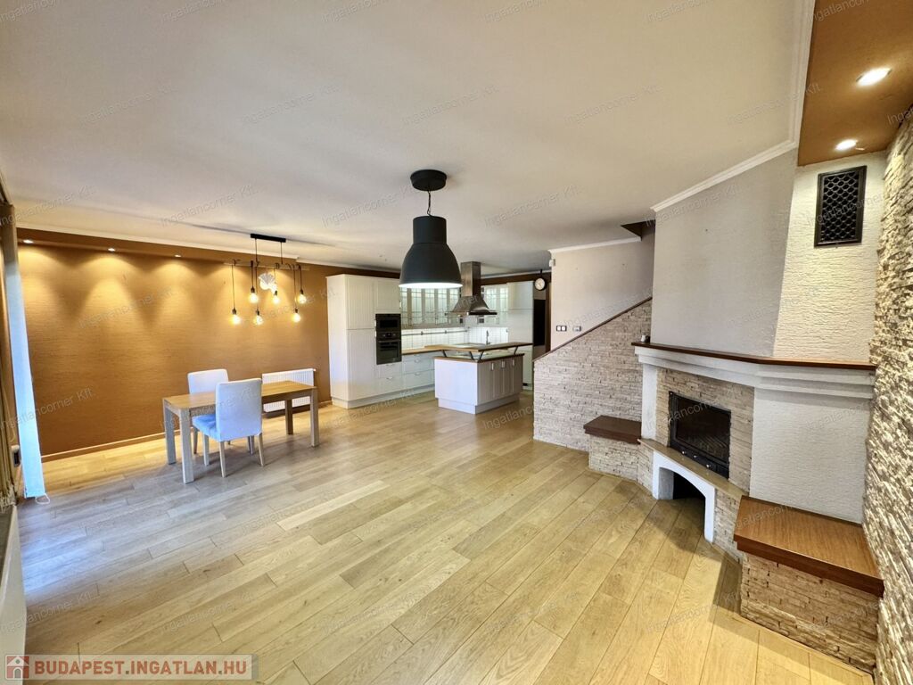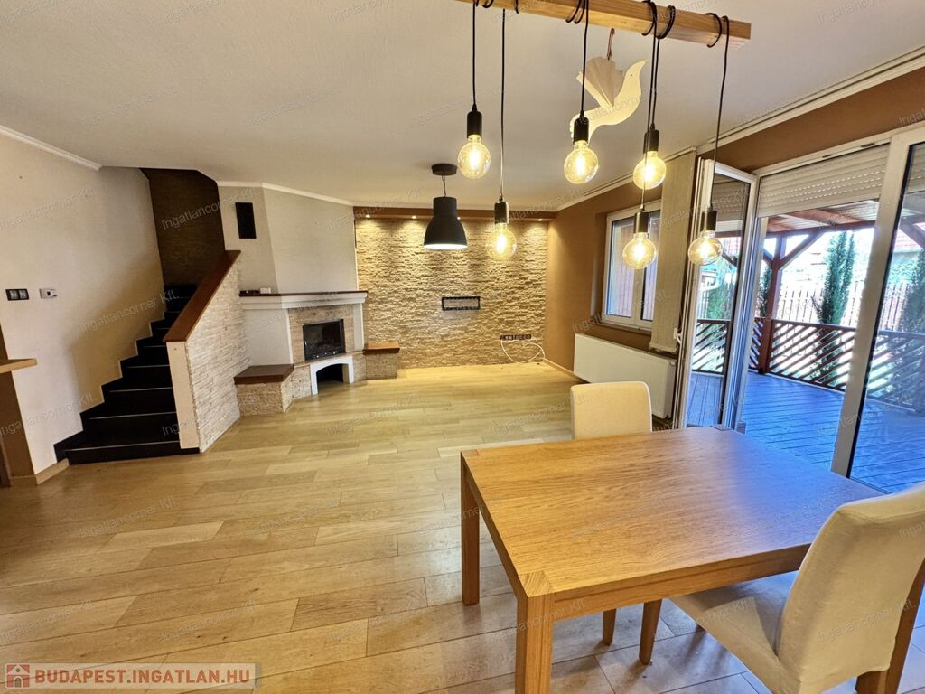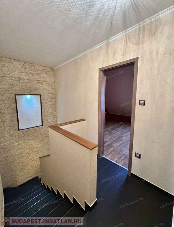Az alsó szinten található az előszoba, zuhanyzó wc-vel, 17,7 nm-es hálószoba, kamra, am-konyha-nappali. A nappaliból egy üvegajtón keresztül léphetünk ki a 16 nm-es teraszra, amely a hátsó kertre nyílik. A felső szinten 2 hálószoba, gardrób, és egy nagy méretű fürdőszoba WC-vel (korábban hatalmas kád volt, illetve szauna bekábelezve) kapott helyet. A nappali – konyha – étkező összesen 41 nm. A padlástér ki lett alakítva, pakolható.