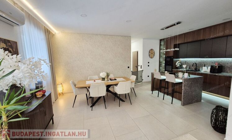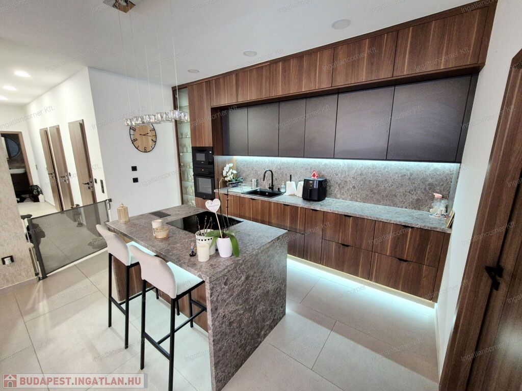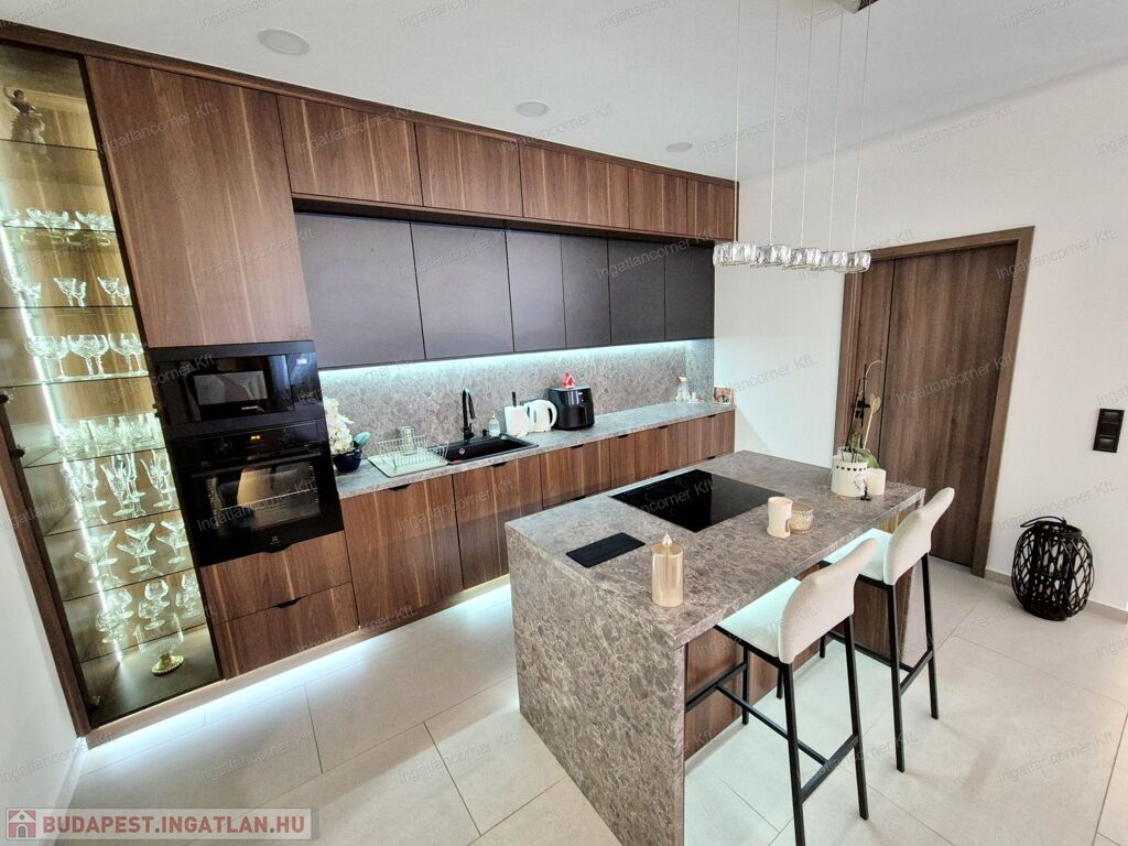 -MODERN KONYHA:A konyha maximális kihasználásával került kialakításra, mennyezetig érő, egyedileg beépített konyhabútorral. A LED-világítással ellátott alsó szekrény, vitrines szekrény praktikus és esztétikus helyet biztosít a kristálypoharak számára.