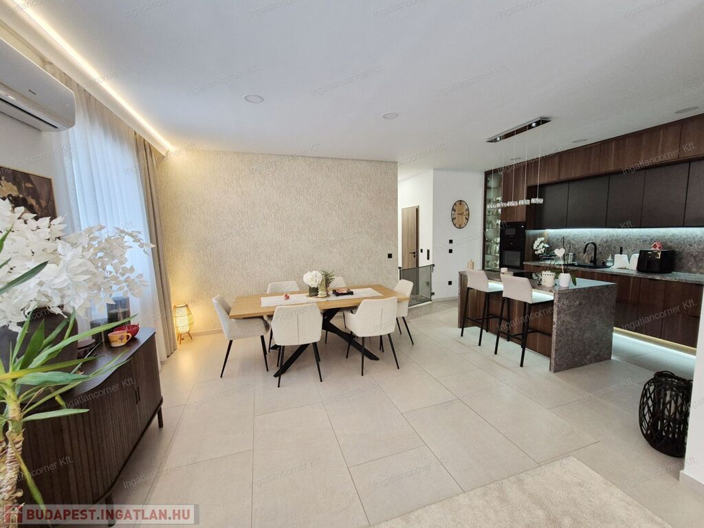 -MODERN KONYHA:A konyha maximális kihasználásával került kialakításra, mennyezetig érő, egyedileg beépített konyhabútorral. A LED-világítással ellátott alsó szekrény, vitrines szekrény praktikus és esztétikus helyet biztosít a kristálypoharak számára.