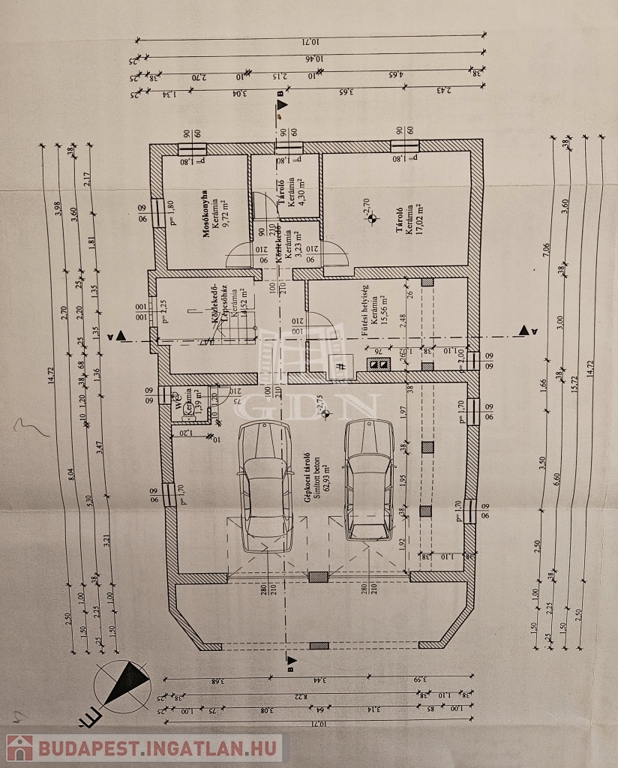 Az alsó szinten (128 m2), 3 autó számára alkalmas garázs, mosókonyha, 3 tároló, gépészeti helyiség található.