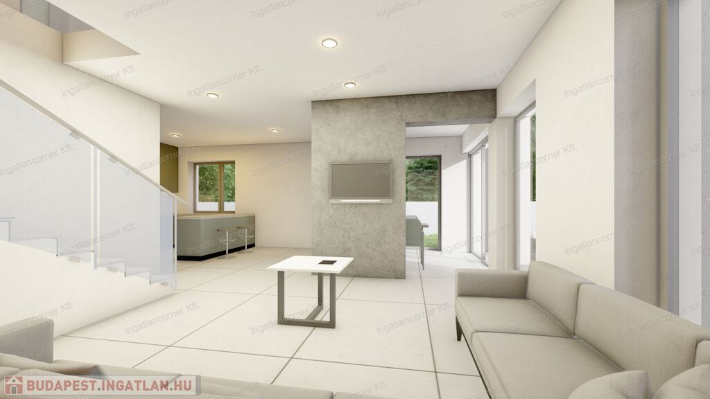 Az alsó szinten helyet kapott egy tágas amerikai konyhás-étkező, nappalival, valamint mellékhelyiség mosdóval.