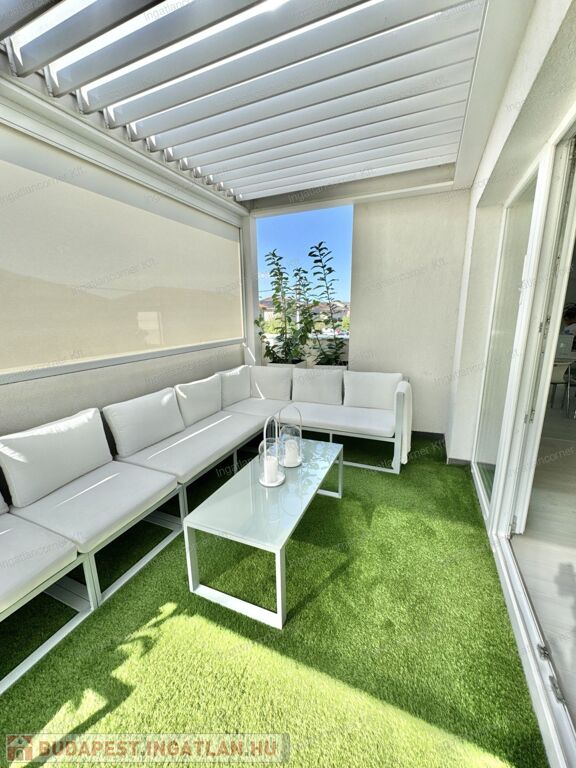 A hatalmas méretű teraszon a virágok és kerti bútor szett mellett kényelmesen elfér a jakuzzi is. A teraszon elektromos sötétítő rendszer lett kiépítve hangulatvilágítással (ennek ára 10 millió Ft újonnan).