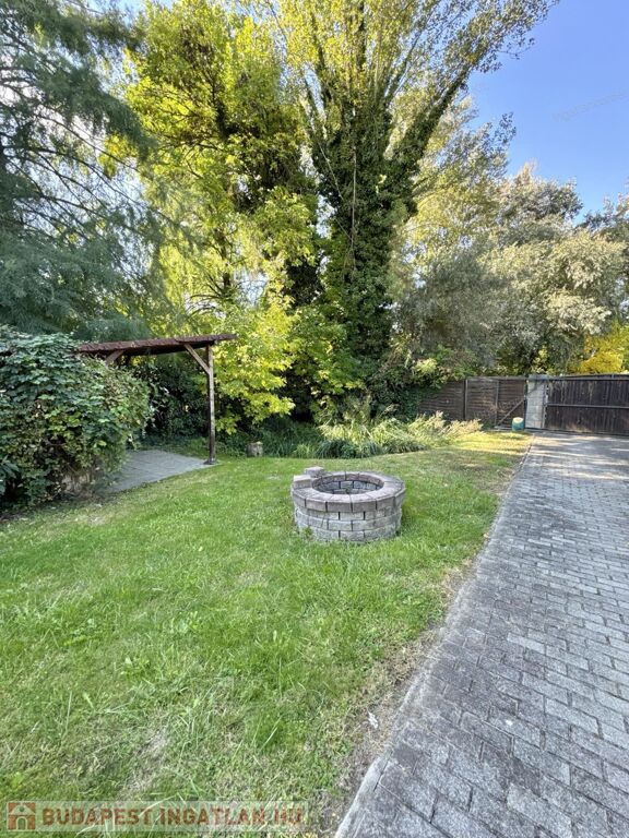 Enyhén lejtős, kettő utcára nyíló telek, gyönyörűen parkosított, ősfás, kerti tavas terület, kerti szaletlivel, gyerek játszóval.