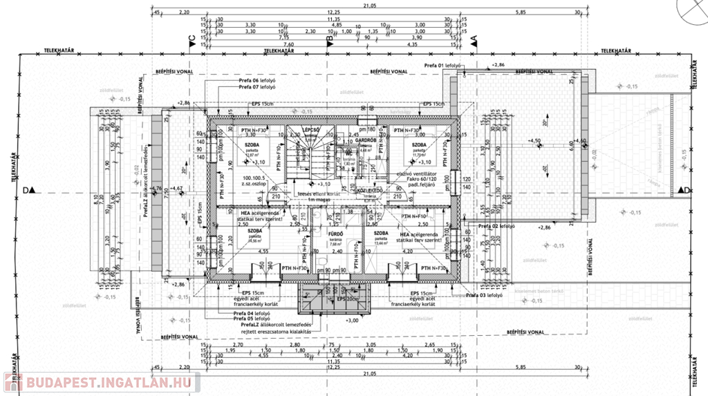 - főfal 15 cm EPS, aljzatban 12 cm, födémen 25 cm szigetelés