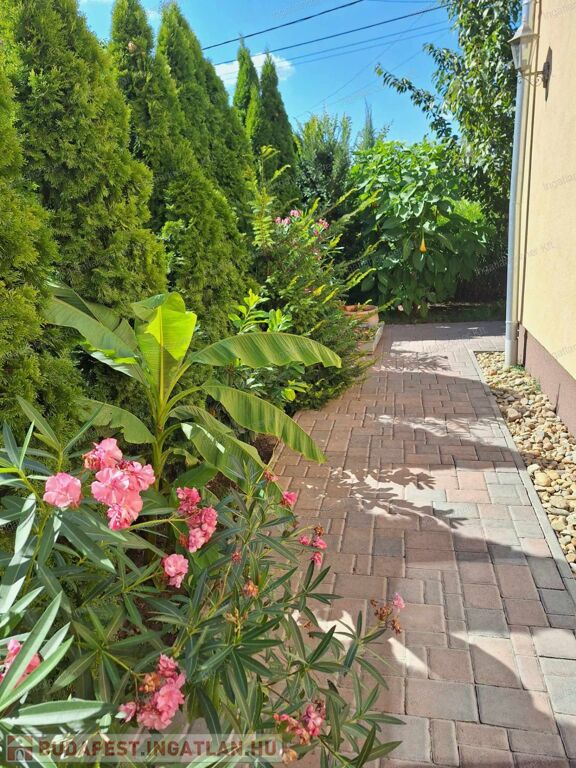 A kert szépen parkosított, hangulatos, gyönyörű örökzöld bokrokkal illetve fákkal.