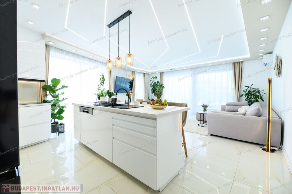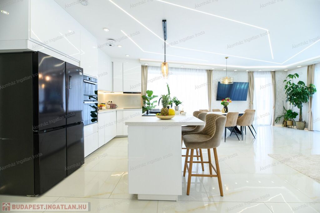 Eladó egy egyedülálló kialakítású, újszerű, 135 m²-es luxus családi ház Dunaharaszti egyik legkedveltebb részén, a Millenniumi lakóparkban, 1023 m²-es, parkosított telken.