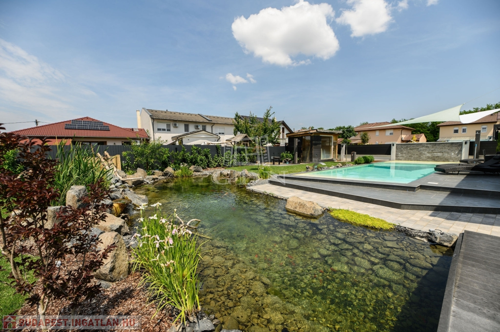 •A gondozott kertben egy 15x4 méteres, LEDVILÁGÍTÁSSAL, vízeséssel ellátott 60m2-es medence, valamint 30 méteres, öntisztuló kerti tó is helyet kapott.