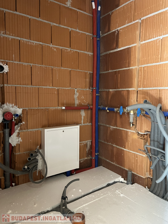 Fűtése 9,5 KW-os hőszivattyúkról ,padlófűtés, használati meleg víz és lakásonként 2db beltéri klíma egységek is erről üzemelnek.