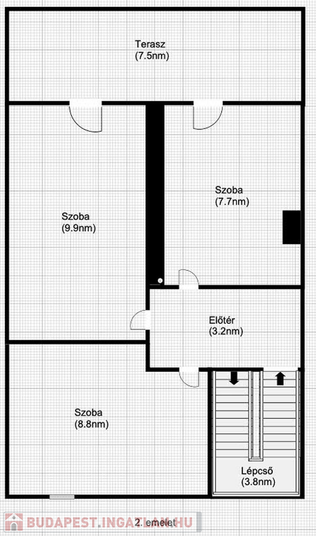 Az első emeleten egy előtér, egy szoba vagy nappali, egy sarokkádas fürdőszoba, valamint egy hatalmas, 15 nm-es terasz található, ahonnan szintén élvezhető a lenyűgöző dunai kilátás.
