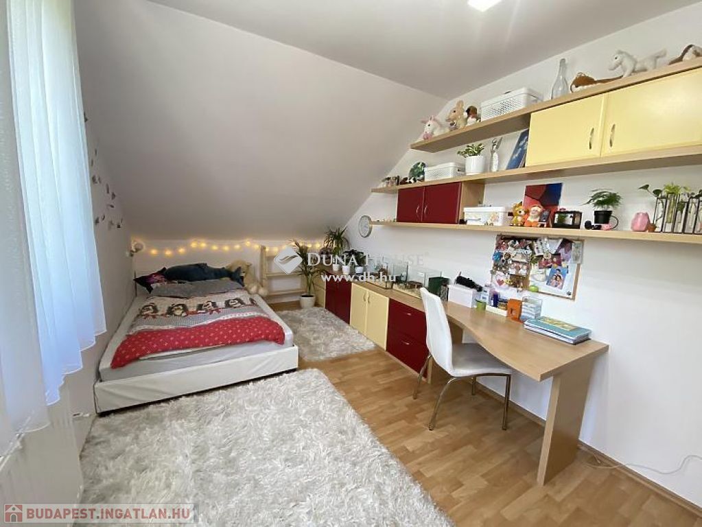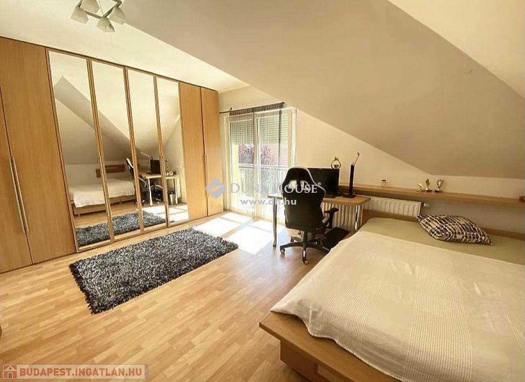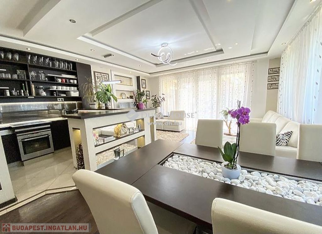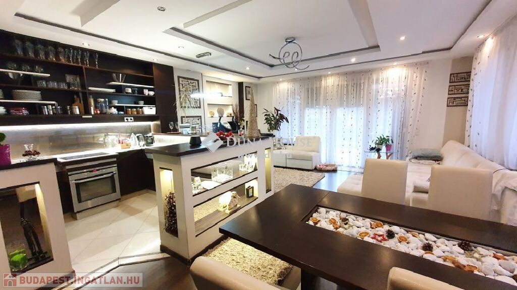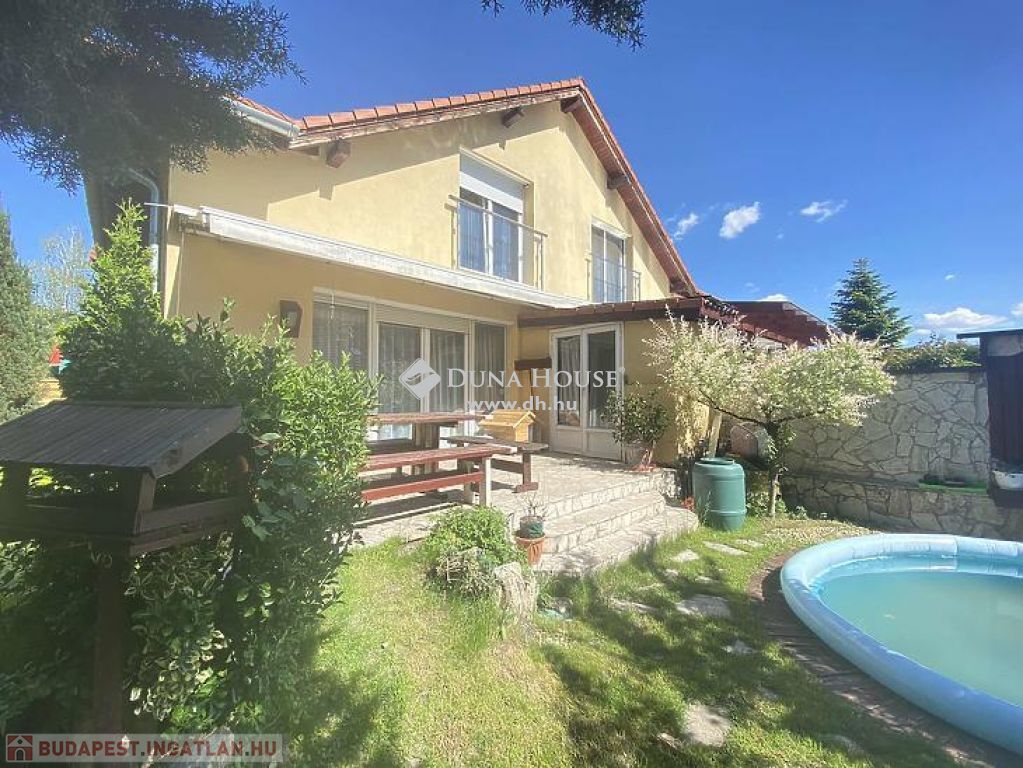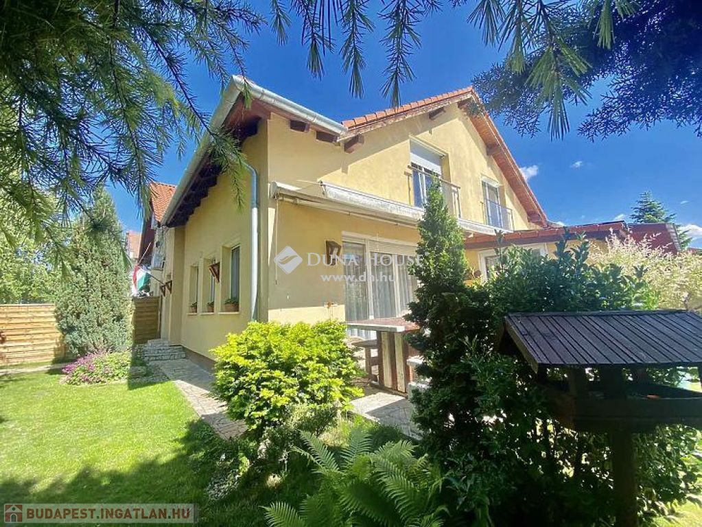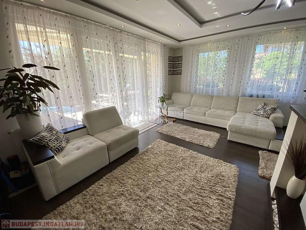 központhoz közel, mégis csendes, átmenő forgalomtól mentes utcában, 2 generációs kitűnő állapotú, modern, stílusos, sok extrával felszerelt ikerház fél eladó.A ház 380 m2-es telken áll, jelenleg 2 lakrészből áll, összesen bruttó 165 m2, 6 szobával és egy 17 m2-es fedett terasszal rendelkezik, dupla komfortos, szép világos, kellemes, otthonos, jó terekkel rendelkező, igény szerint akár tovább alakítható,A ház 2006-ban épült, 38-as Porotherm téglából, és 10 cm-es dryvit, szigetelést kapott.A ház téli teljes rezsiköltsége 46 000 Ft.A 2 szint között betonfödémmel ellátott, a tető Bramac cseréppel fedett.A fűtés és a meleg víz ellátás cirkó berendezéssel megoldottA ház hő és hangszigetelt nyílászárókkal, redőnyökkel és szúnyoghálóval felszerelt.A burkolatok mindenhol jó minőségűek, és szép állapotban vannak.Az ingatlan 2 generációs jelen pillanatban, de könnyen visszaalakítható, egybe nyitható ahogy korábban volt, ebben az esetben van lehetőség egy fűtött garázs visszaállítására is, de tovább is bővíthető a ház akár 3 teljesen szeparált külön lakrészre is.A ház riasztó és klíma berendezéssel felszerelt.1 lakrészben jelenleg:-amerikai konyhás nappali- egy hálószoba,- fürdőszoba +WC,- kamra- külön leválasztott kertrész van2. lakrészben, ami belső 2 szintes jelenleg:-amerikai konyhás nappali, innen nyílik a terasz, és kert kapcsolat-3 hálószoba az emeleten,- fürdőszoba,- külön WC,- kamra,padlástér is innen érhető el ahol még 30 m2 szabadon alakítható, akár bővíthetőA kert parkosított, öntözőrendszerrel ellátott.A kertben van egy medence, egy kerti tó, és egy fúrt kút is.Jelenleg 2 db autóbeállási lehetőség van, amelyből egy fedett és egy fedetlen beállásra van hely.TV és internet szolgáltatást jelenleg a T-Home biztosítja.Extrák:- földszinten kisebb lakrészben a nappaliban padlófűtés.- 2 tároló az udvarban (12 nm-es, 6 nm-es)- Klíma- Elektromos kandalló- Fúrt kút- Kerti tó- Medence- RiasztóA vételár részét képezi a konyhabútor, a klíma berendezés, az elektromos kandalló, riasztó berendezés, igény szerint egyéb berendezések megállapodás tárgyát képezik.A környék nagyon jól ellátott, bevásárlás, iskola, óvoda, bölcsőde, központ, közlekedés, Duna part, percek alatt elérhetőek.