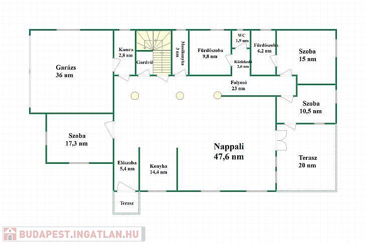 A teljes alapterület – beleértve a garázst, pincét és teraszt – 345 nm.